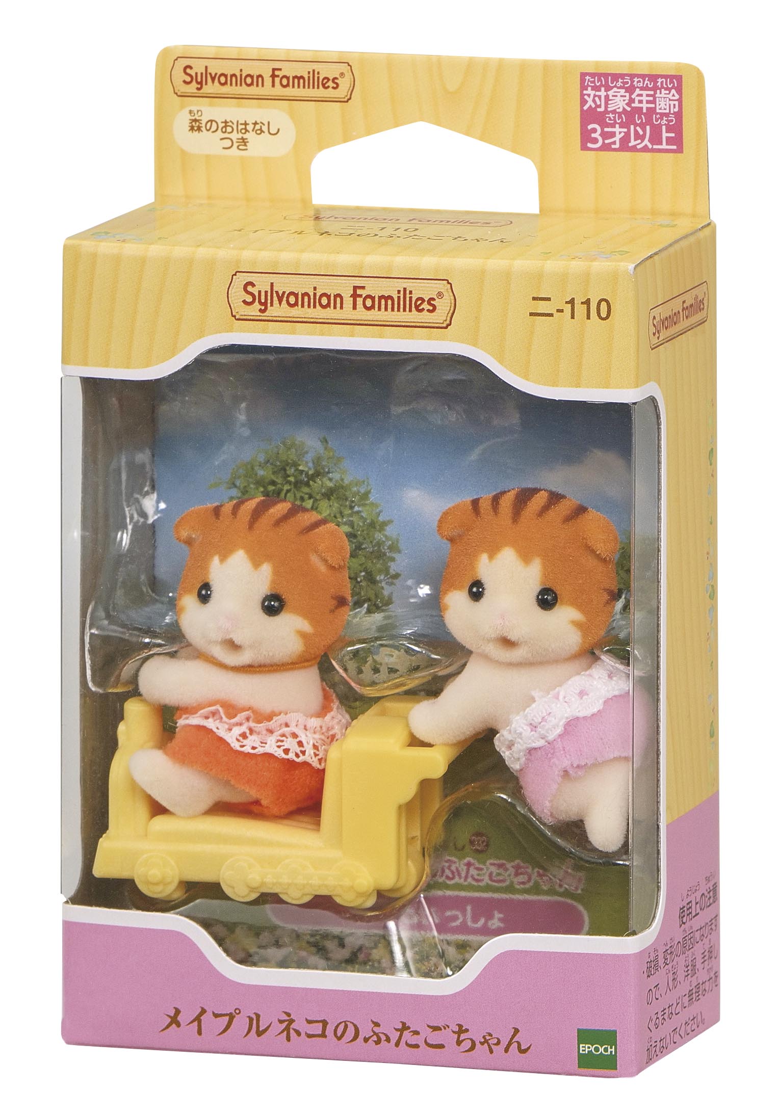 シルバニアファミリーのメイプルネコふたごちゃん(おすわり、はいはい)と、手押しぐるまのセットです。