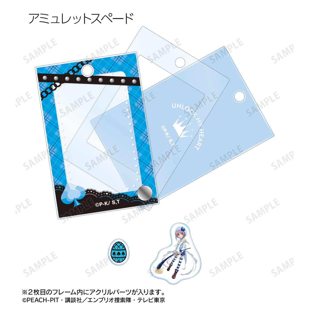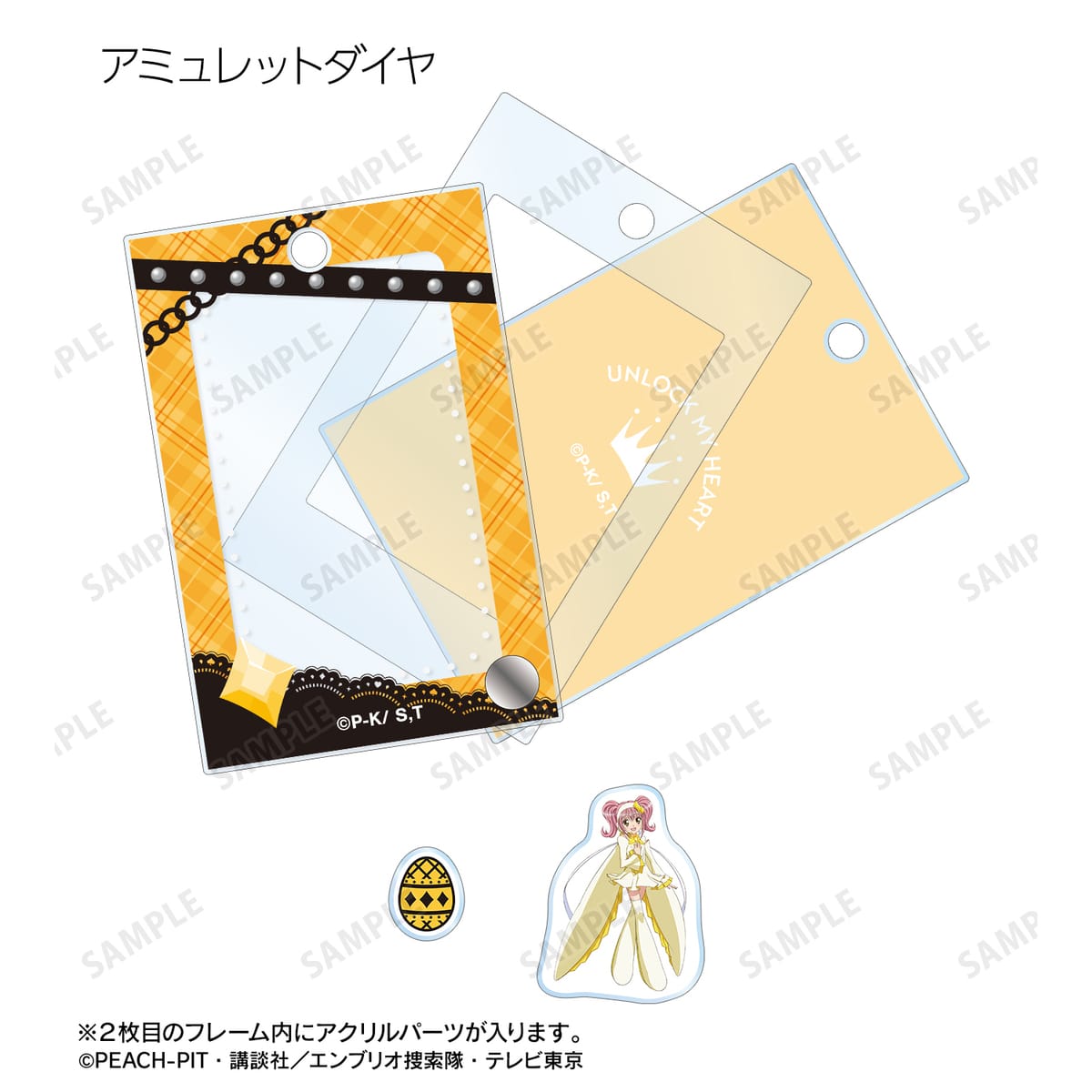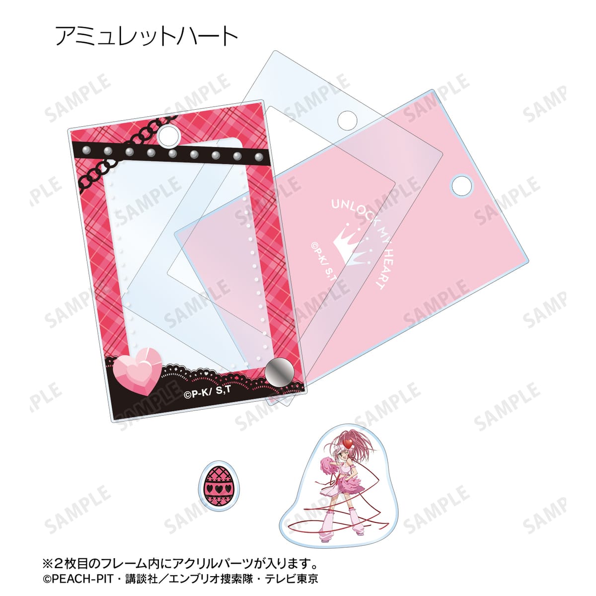 アミュレットハート、アミュレットスペード、アミュレットクローバー、アミュレットダイヤ、アミュレットフォーチュン、アミュレットエンジェル、アミュレットデビルのイラスト、ランのしゅごたま、ミキのしゅごたま、スゥのしゅごたま、ダイヤのしゅごたま、リボン、天使の羽、悪魔の羽のモチーフを、パーツ付きのフレームアクリルチャームに仕上げました。