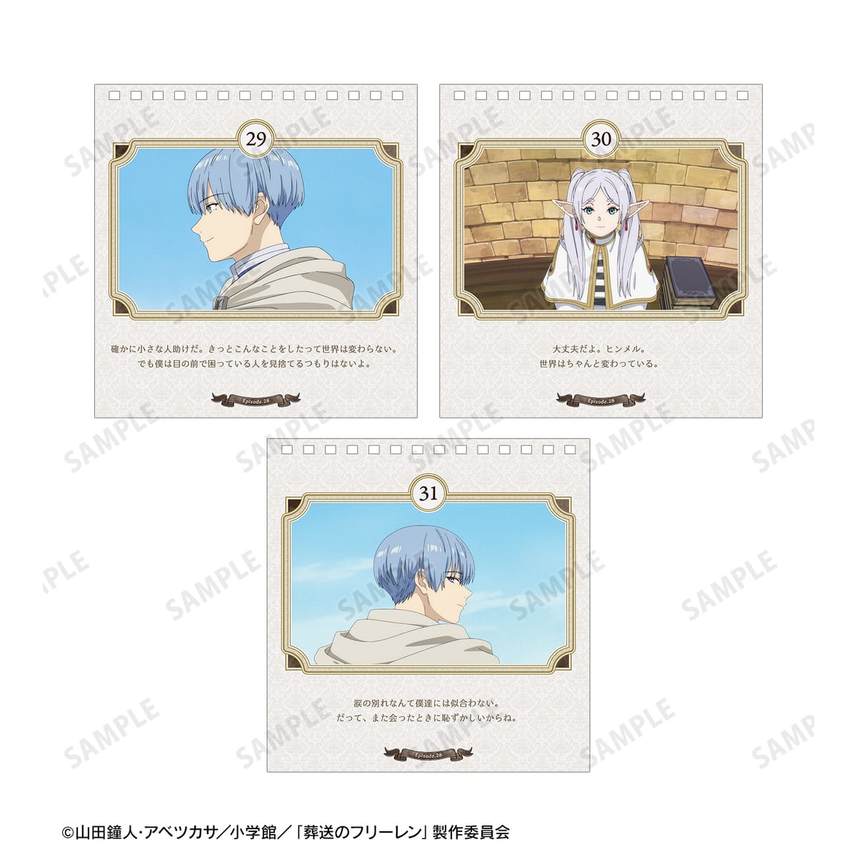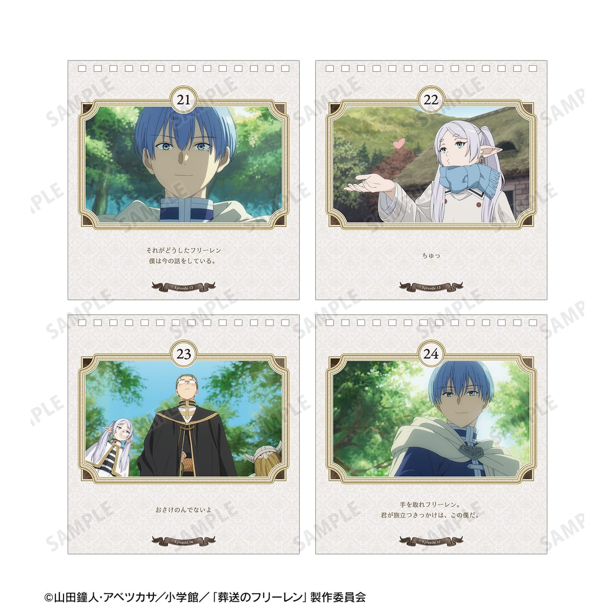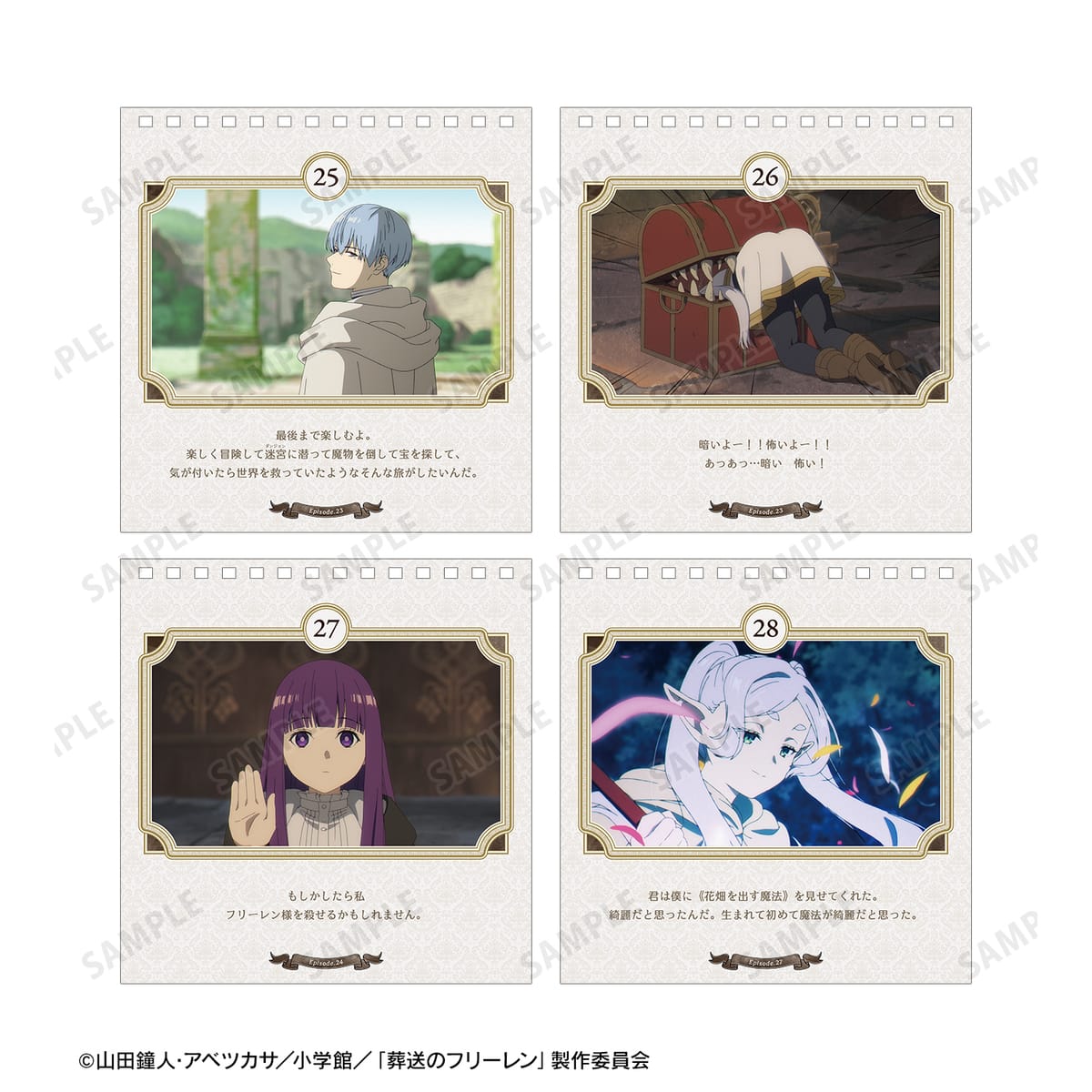 フリーレン、フェルン、シュタルク、ヒンメル、ハイター、アイゼン、ザインの印象的なシーンを日替わりでお楽しみいただける日めくりカレンダーに仕上げました。