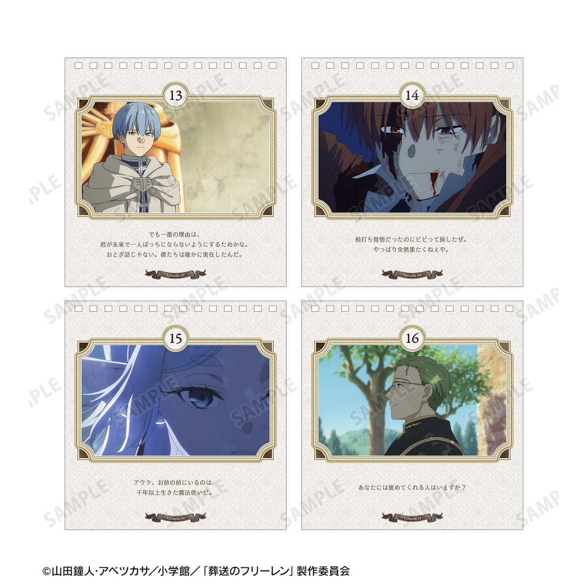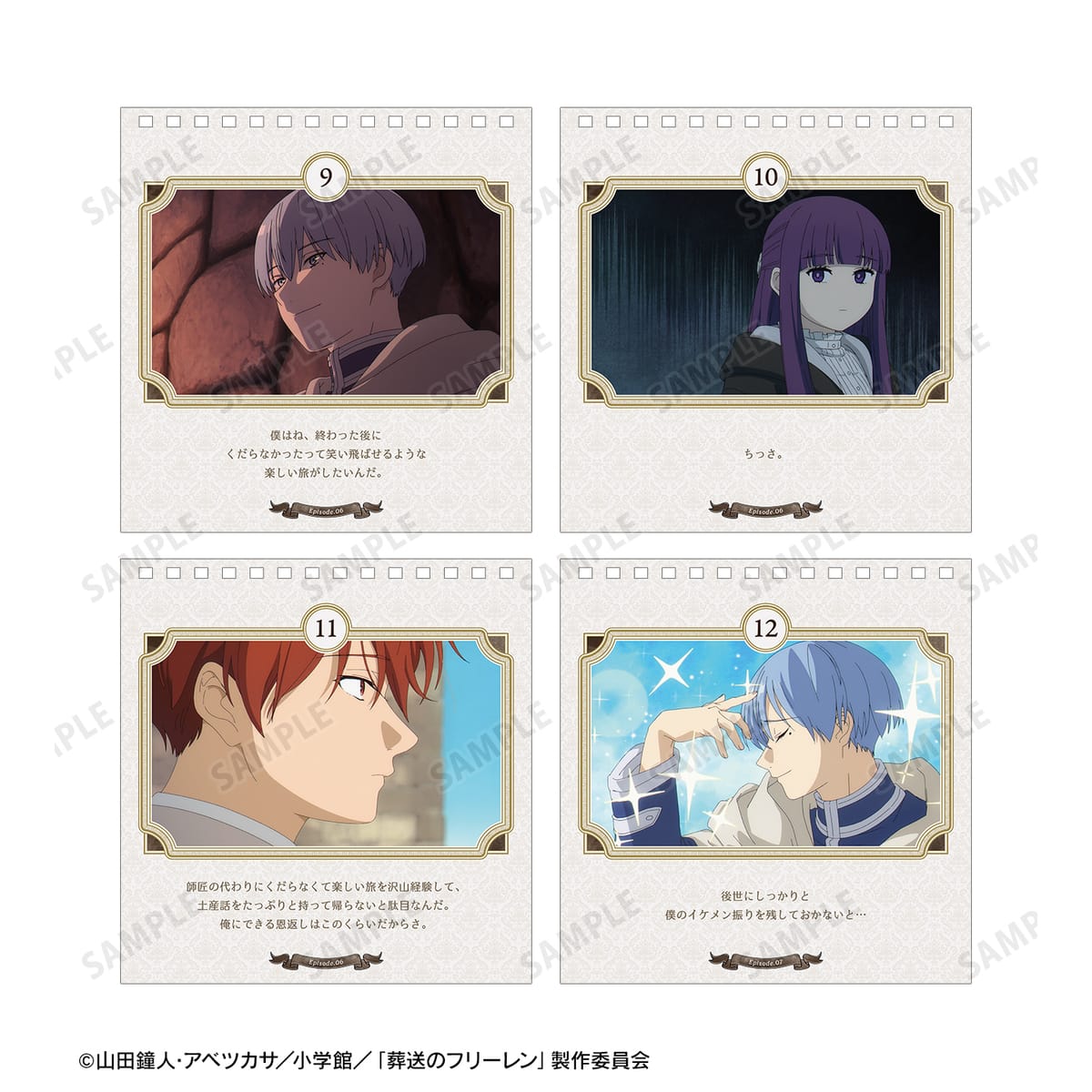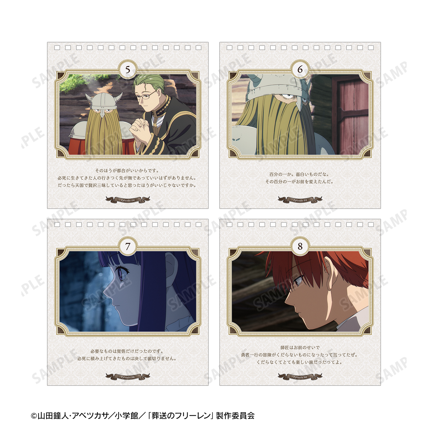 フリーレン、フェルン、シュタルク、ヒンメル、ハイター、アイゼン、ザインの印象的なシーンを日替わりでお楽しみいただける日めくりカレンダーに仕上げました。