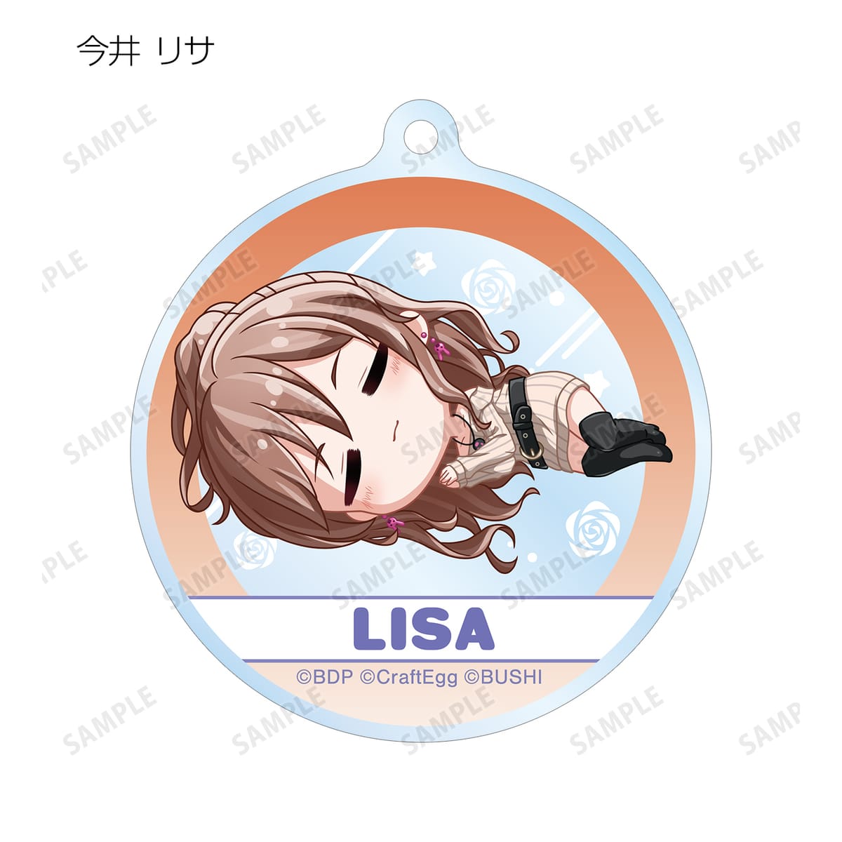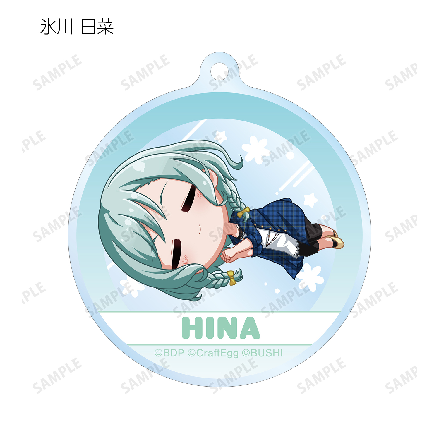 丸山 彩、氷川 日菜、白鷺 千聖、大和 麻弥、若宮 イヴ、湊 友希那、氷川 紗夜、今井 リサ、宇田川 あこ、白金 燐子がころんと寝ているちびキャラを新たに描き起こし、アクリルキーホルダーに仕上げました。