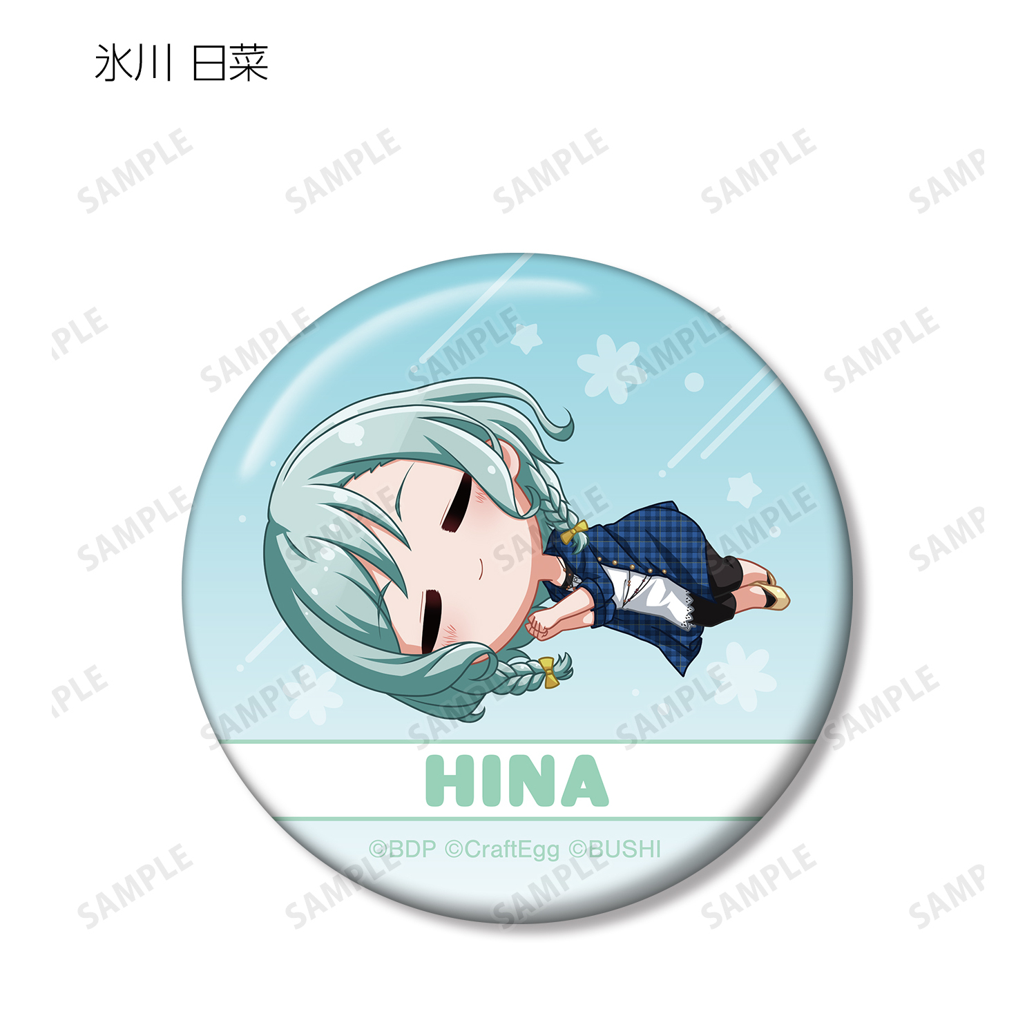 丸山 彩、氷川 日菜、白鷺 千聖、大和 麻弥、若宮 イヴ、湊 友希那、氷川 紗夜、今井 リサ、宇田川 あこ、白金 燐子がころんと寝ているちびキャラを新たに描き起こし、缶バッジに仕上げました。