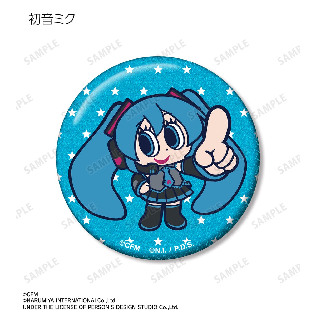 初音ミク、鏡音リン、鏡音レン、巡音ルカ、MEIKO、KAITO、ナカムラくんを描き起こしたANGEL BLUEのコラボイラストを、グリッター加工を施した缶バッジに仕上げました。