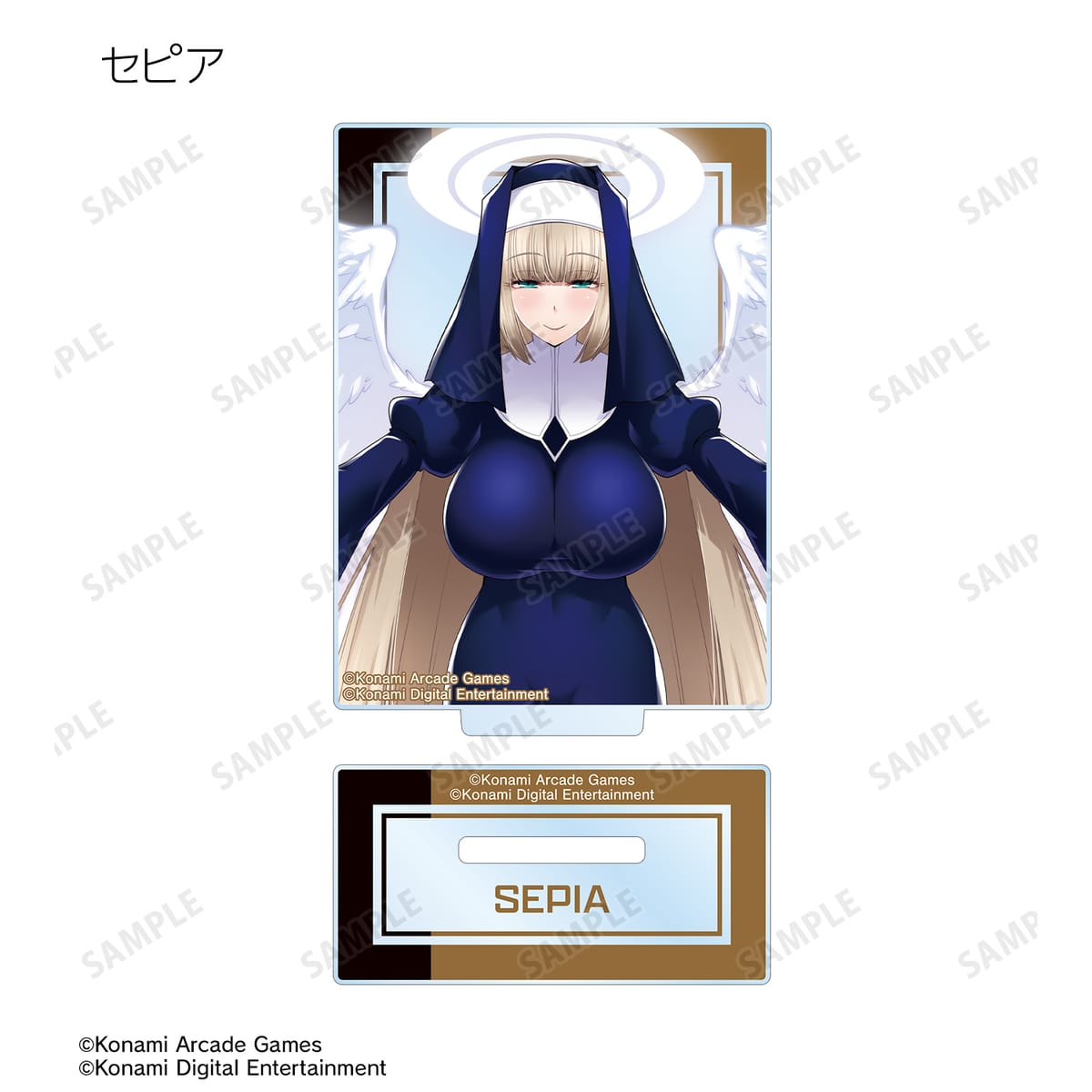 セピア、グリムアロエ、パプル、ブラス、モモコ、パイン、プルーン、メロンのイラストをアクリルスタンドに仕上げました。