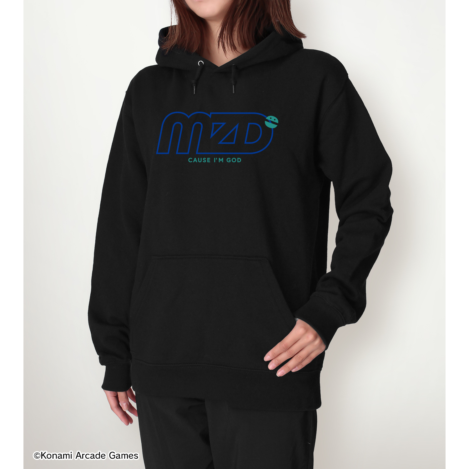 MZD、ポップくんの描き起こし、WIN時のセリフ「神だから?」の英語訳「BECAUSE I'M GOD」を、プルオーバーフーディーに仕上げました。