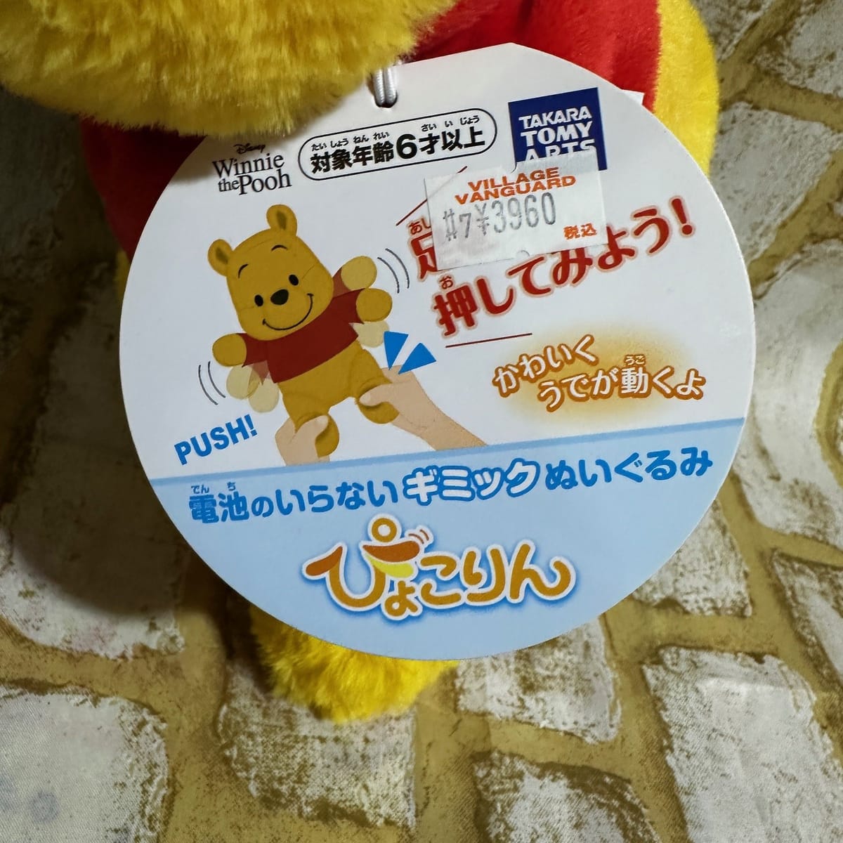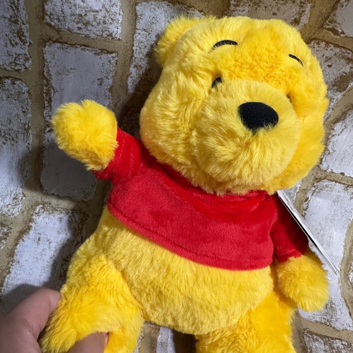 足を押すと腕がぴょこんと上がる、電池を使わないギミックのついた「くまのプーさん」のぬいぐるみ!
