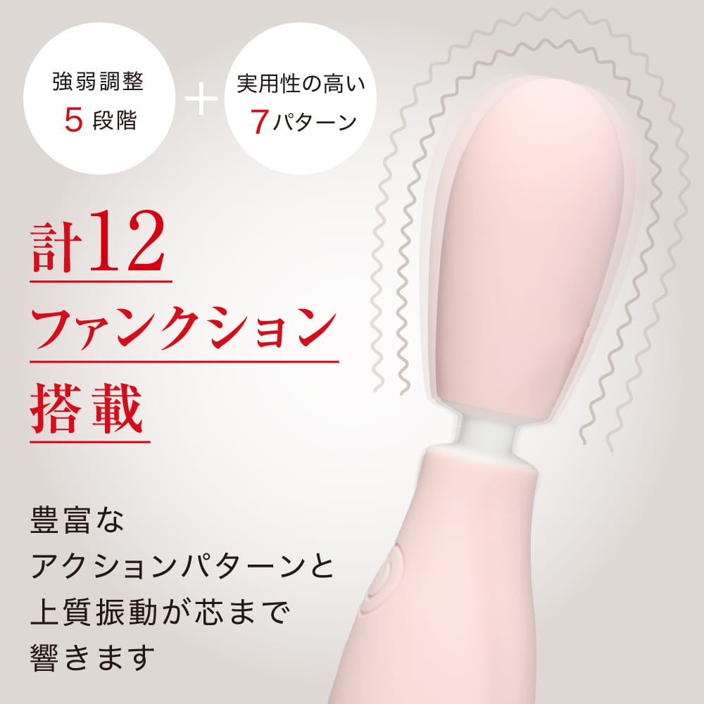 ふにゃっと曲がる今までに無い当て心地を実現したソフトネックと滑らかで肌触りが良く摩擦ストレスを極限まで軽減したプレミアムシルキーシリコン素材を採用したヘッドが唯一無二の感覚を演出するバイブレーションポットです。精密に組み合わせたパーツと上質なモーターにより、振動音がわずか30-55dBの静音設計なのに芯まで響くバイブは細かい調節が可能な5段階強弱調整と実用性の高い7パターン振動の計12ファンクション搭載。握りやすくしっかりと手に馴染むエルゴノミックデザインを採用。IPX7の完全防水性能だから水辺でも安心してご使用頂けます。使用後もしっかり洗えるから衛生的に長く楽しめます。120分の充電で最大60分の連続使用が可能です。(使用環境により大幅に増減します。)上質な振動を優しい当て心地で演出する新しいコンセプトモデルです。