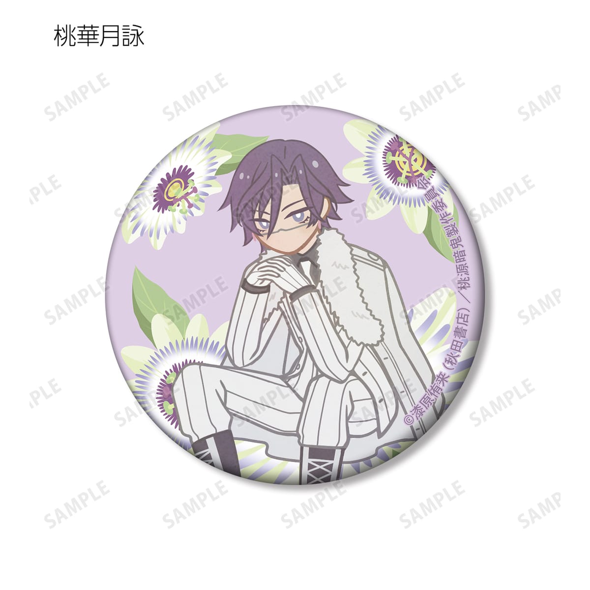 一ノ瀬四季、無陀野無人、皇后崎 迅、花魁坂京夜、淀川真澄、桃寺神門、桃華月詠、桃角桜介のイラストをボタニカルデザインに落とし込んで繊細なタッチで新たに描き起こし、マットな手触りの缶バッジに仕上げました。