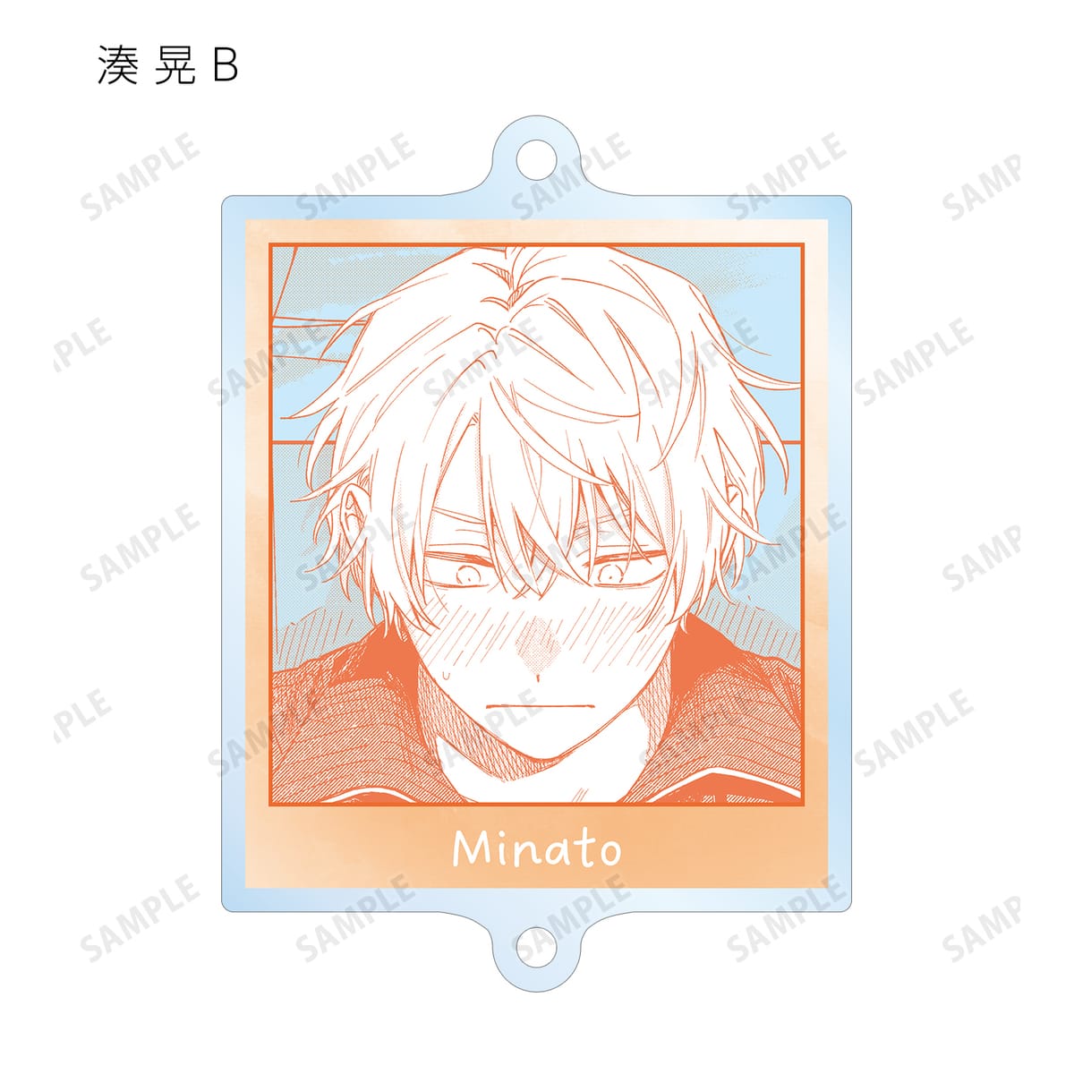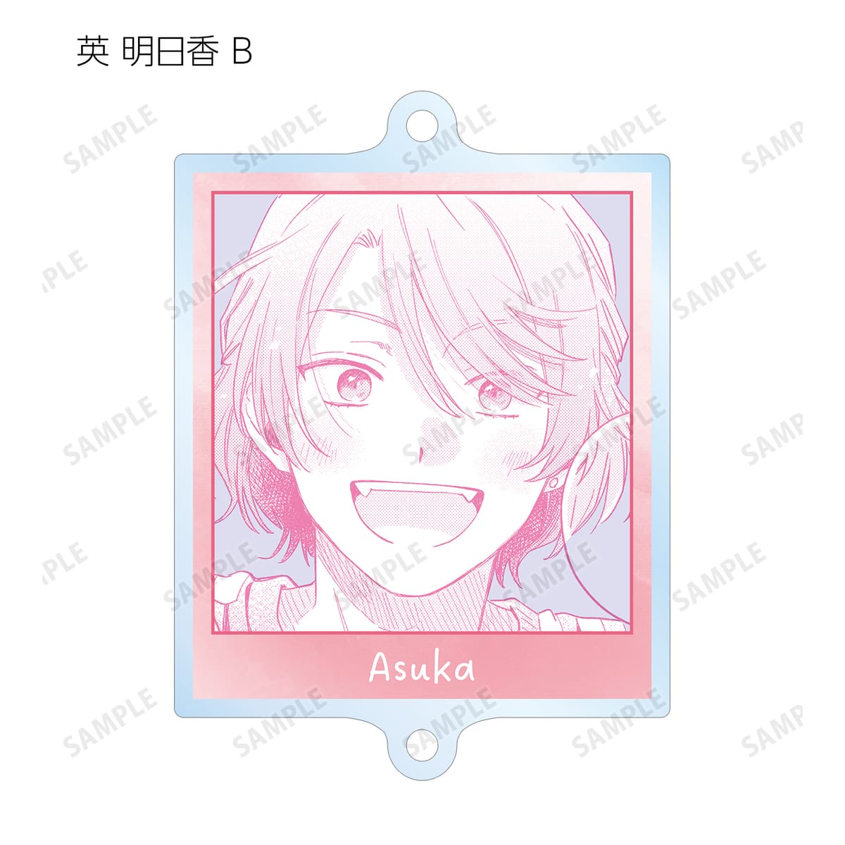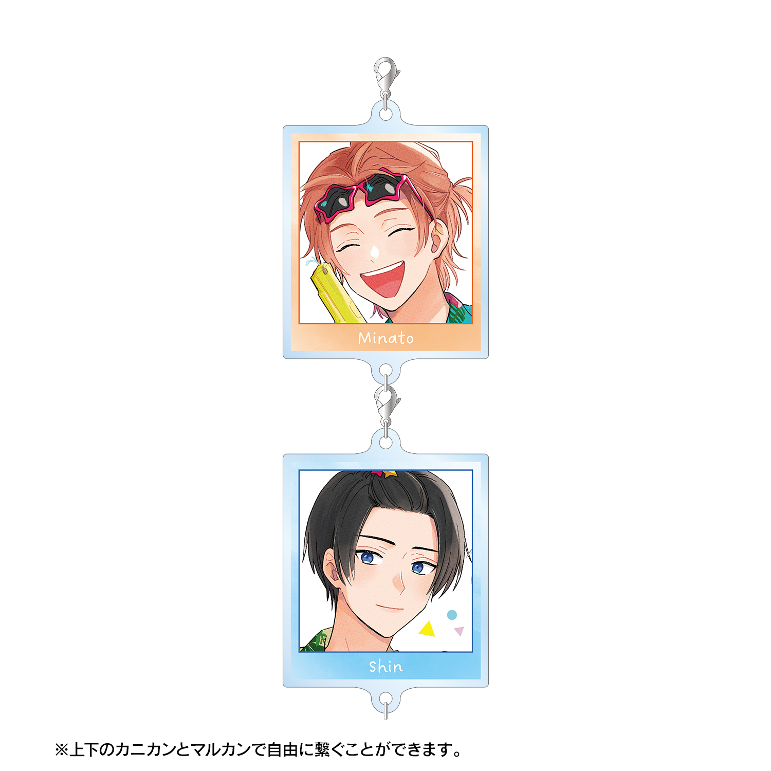 湊 晃、香月 慎太郎、英 明日香、佐久間 柊のカラーイラスト、原作コマをカニカンとマルカンでつなげることのできるアクリルキーホルダーに仕上げました。