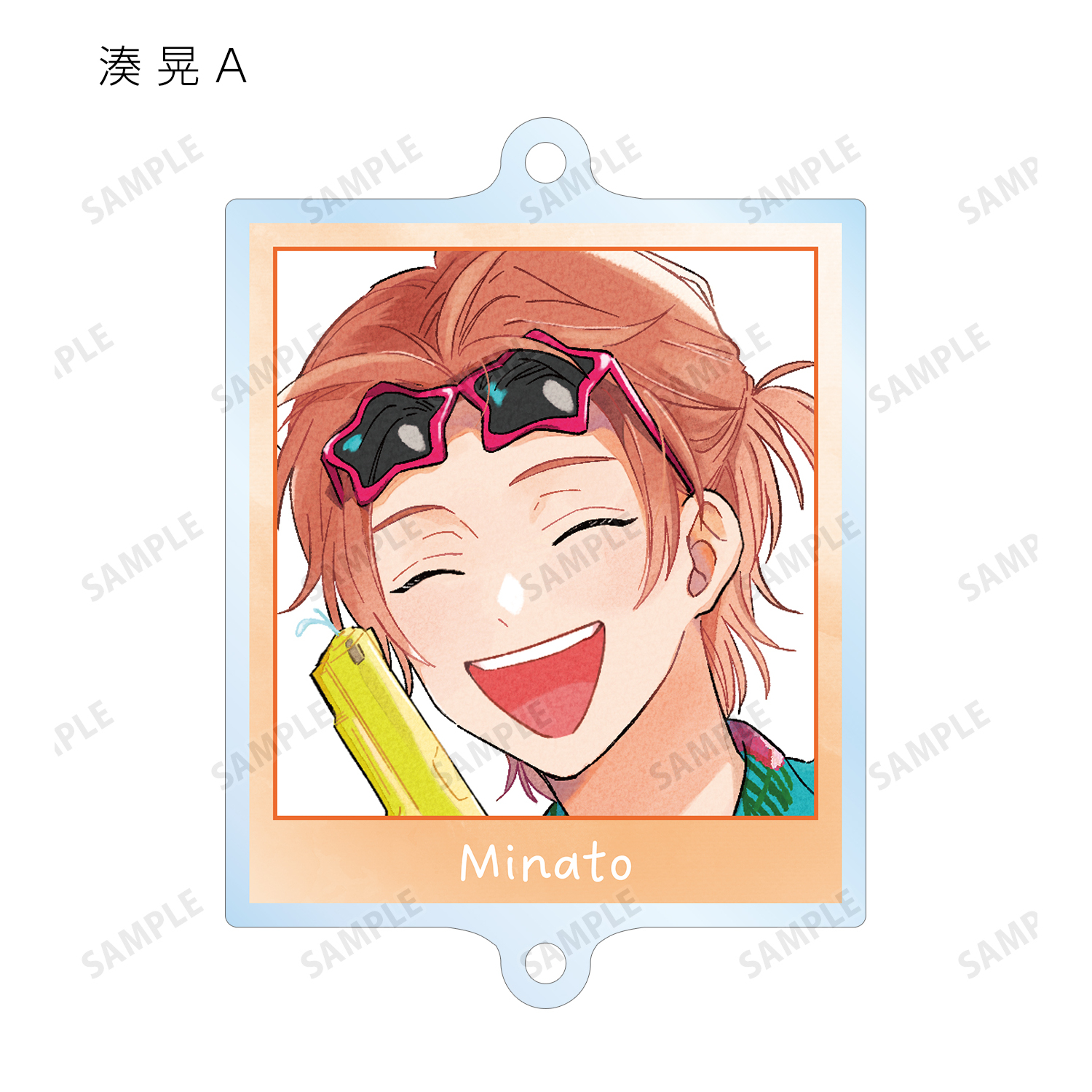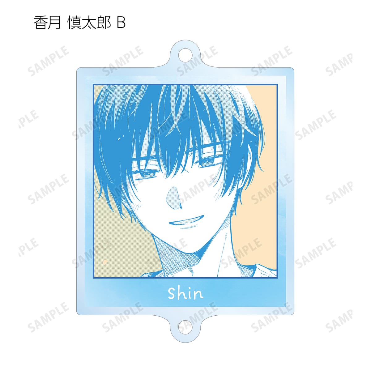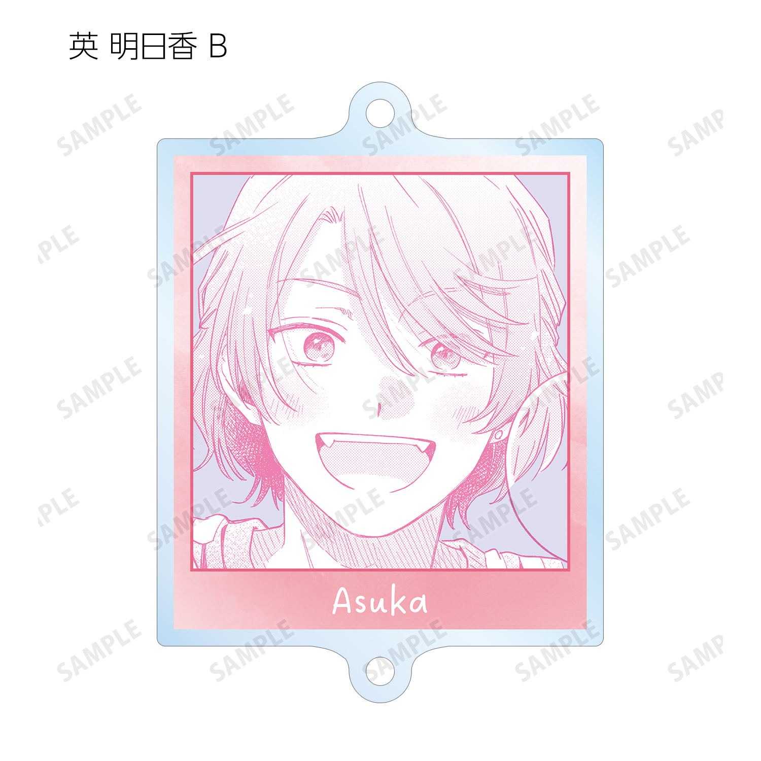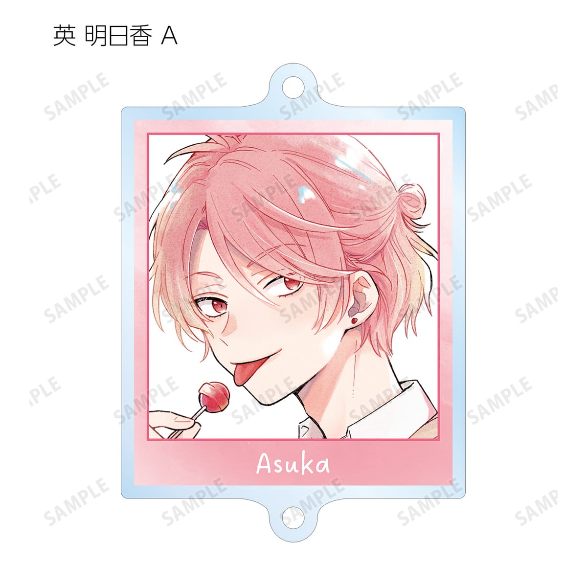 湊 晃、香月 慎太郎、英 明日香、佐久間 柊のカラーイラスト、原作コマをカニカンとマルカンでつなげることのできるアクリルキーホルダーに仕上げました。