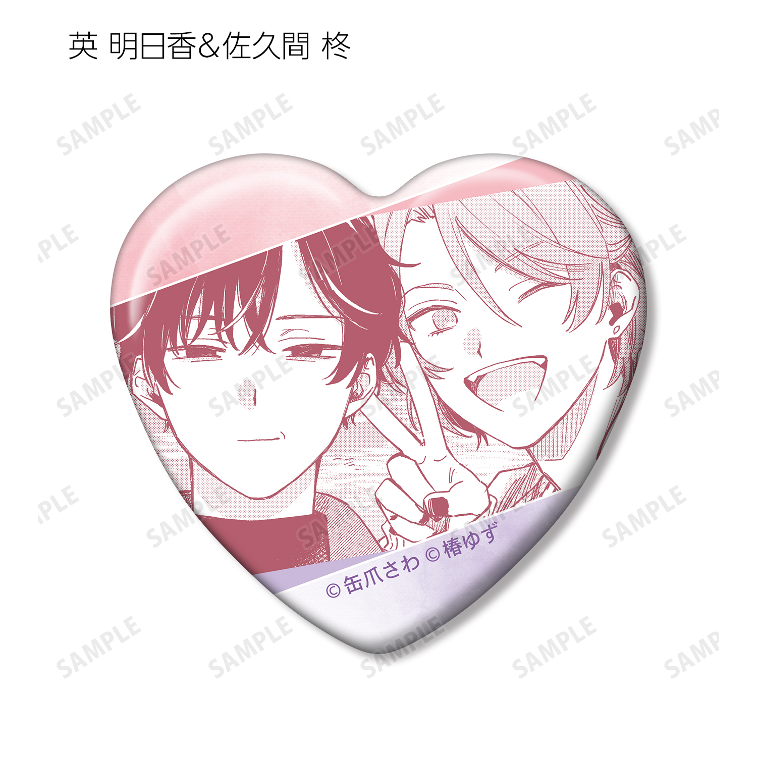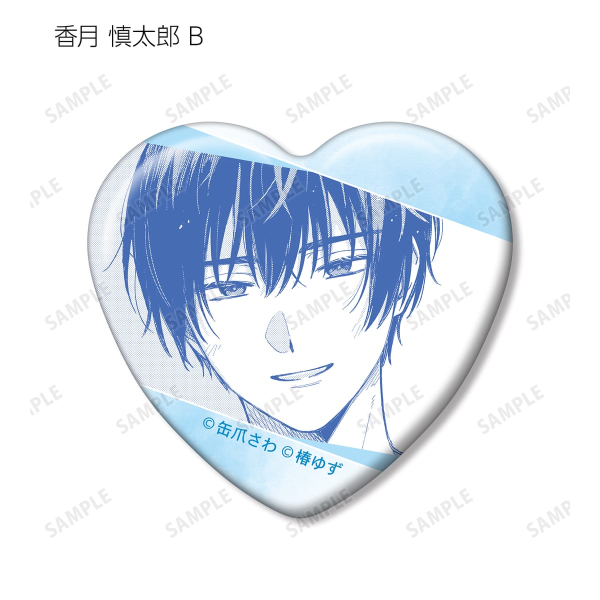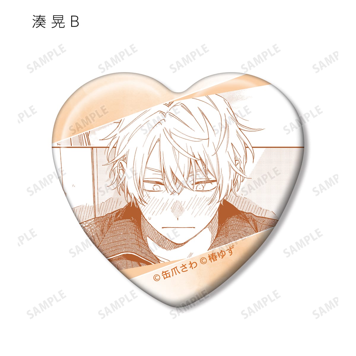 湊 晃、香月 慎太郎、英 明日香、佐久間 柊のカラーイラスト、原作コマをハート型の缶バッジに仕上げました。