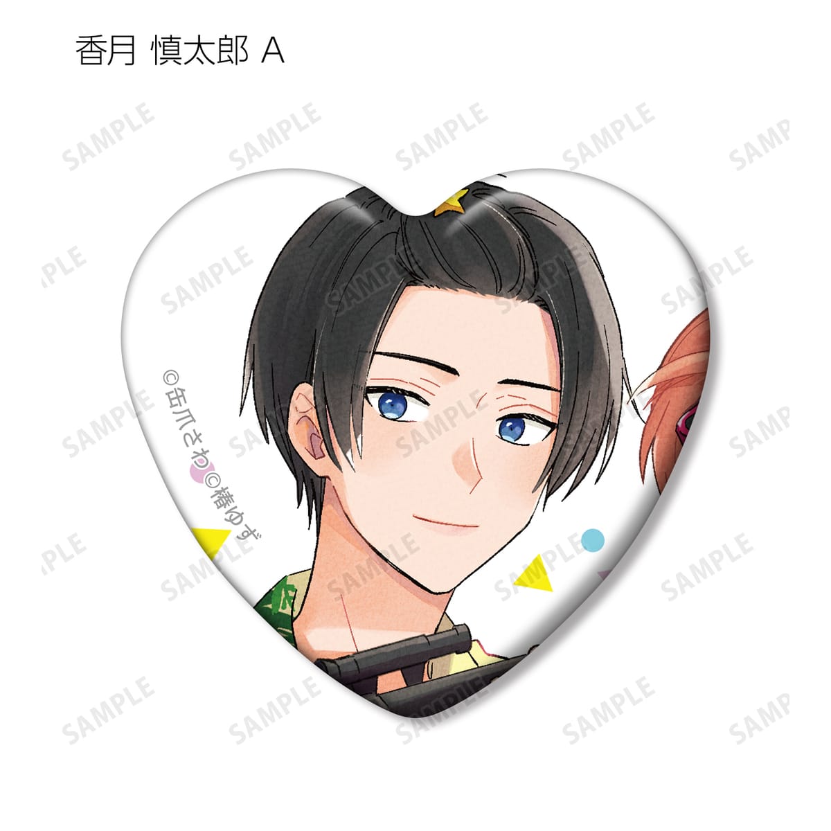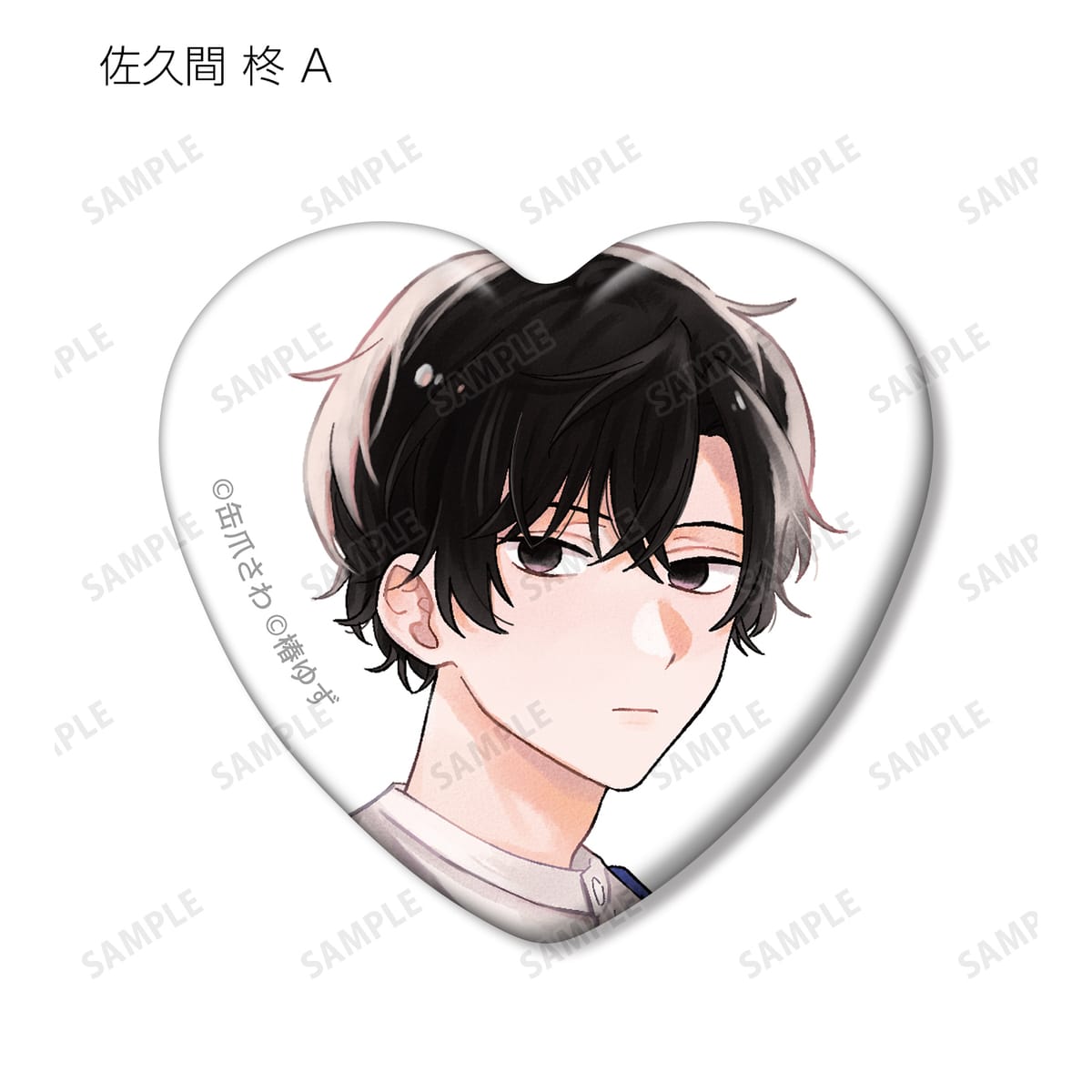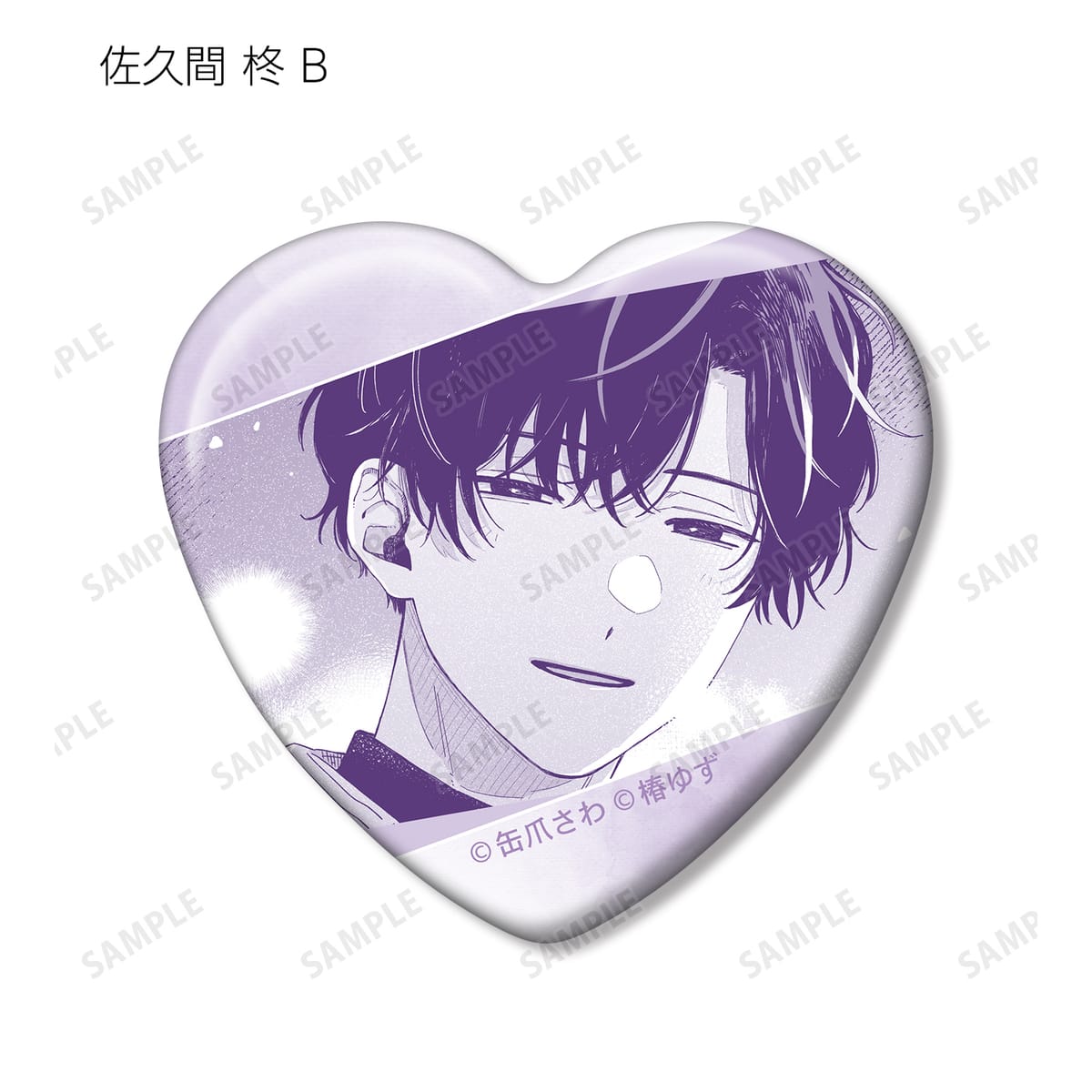 湊 晃、香月 慎太郎、英 明日香、佐久間 柊のカラーイラスト、原作コマをハート型の缶バッジに仕上げました。