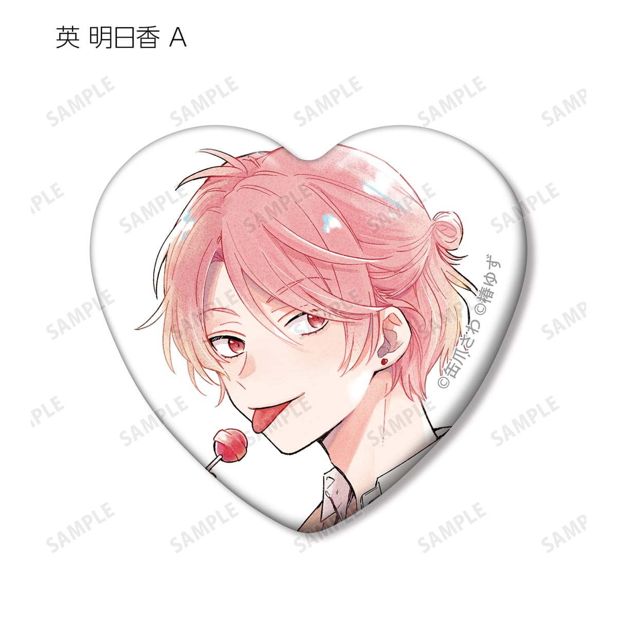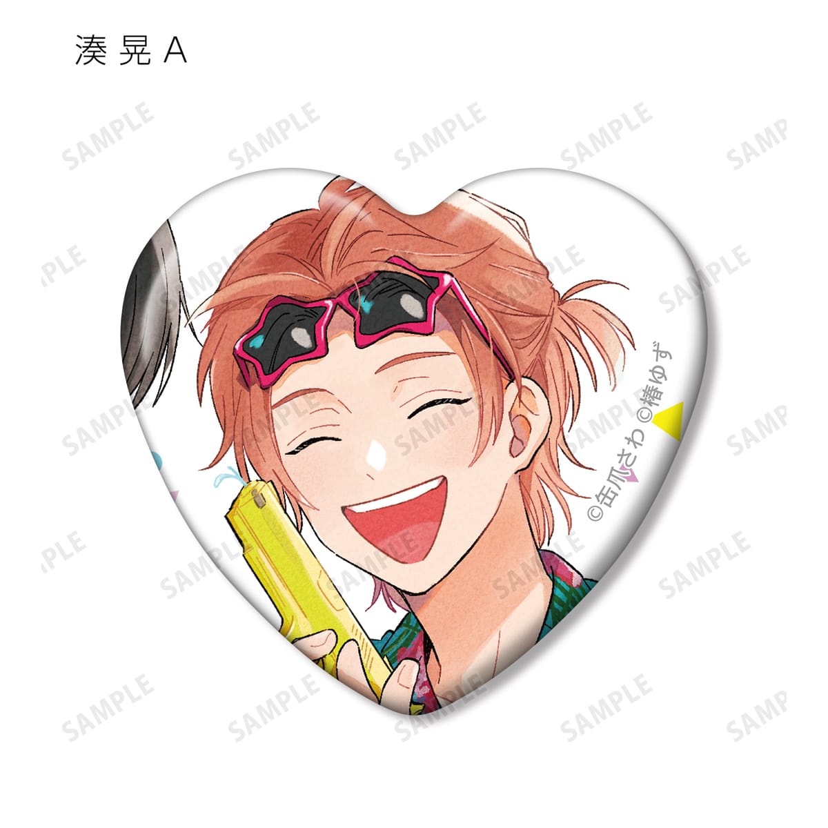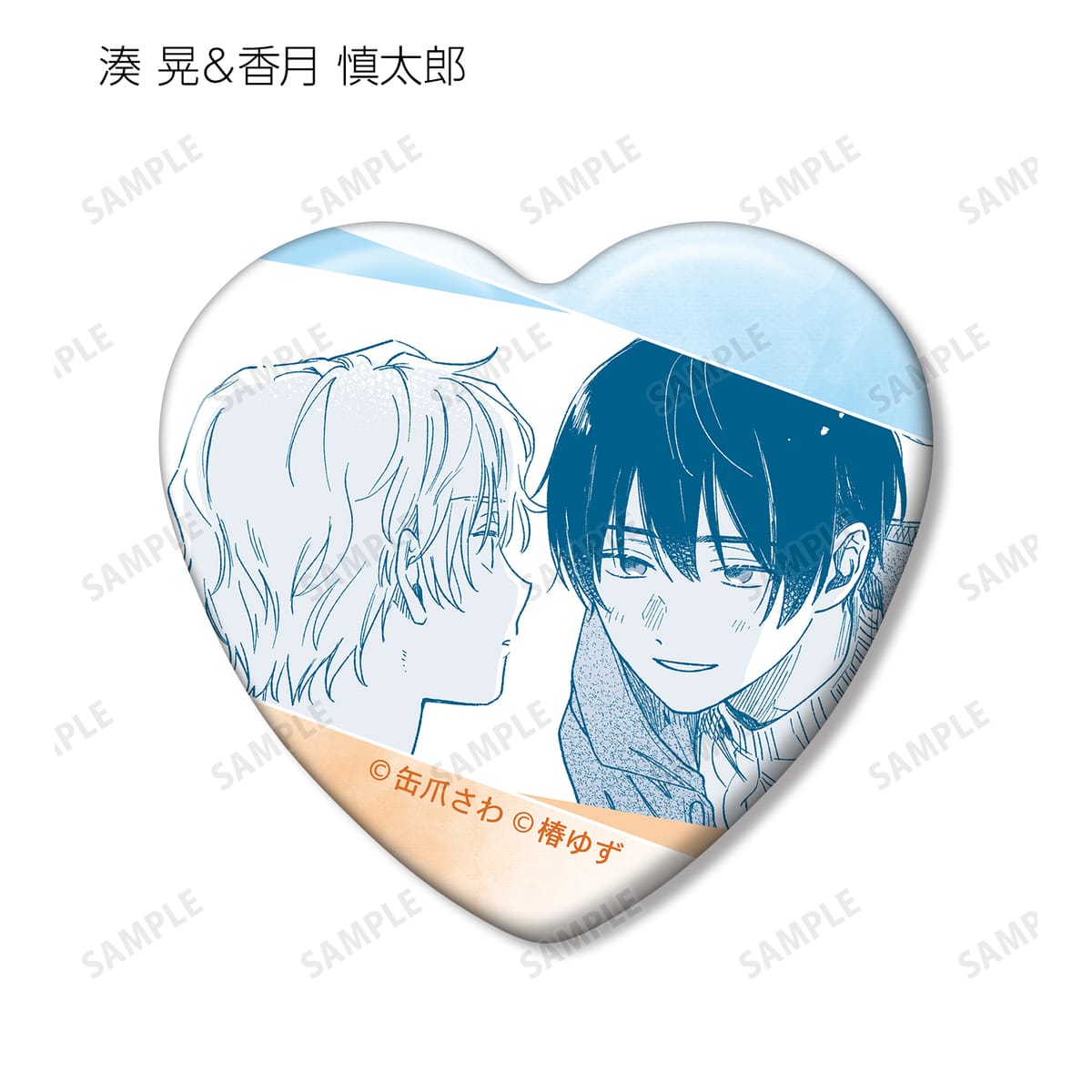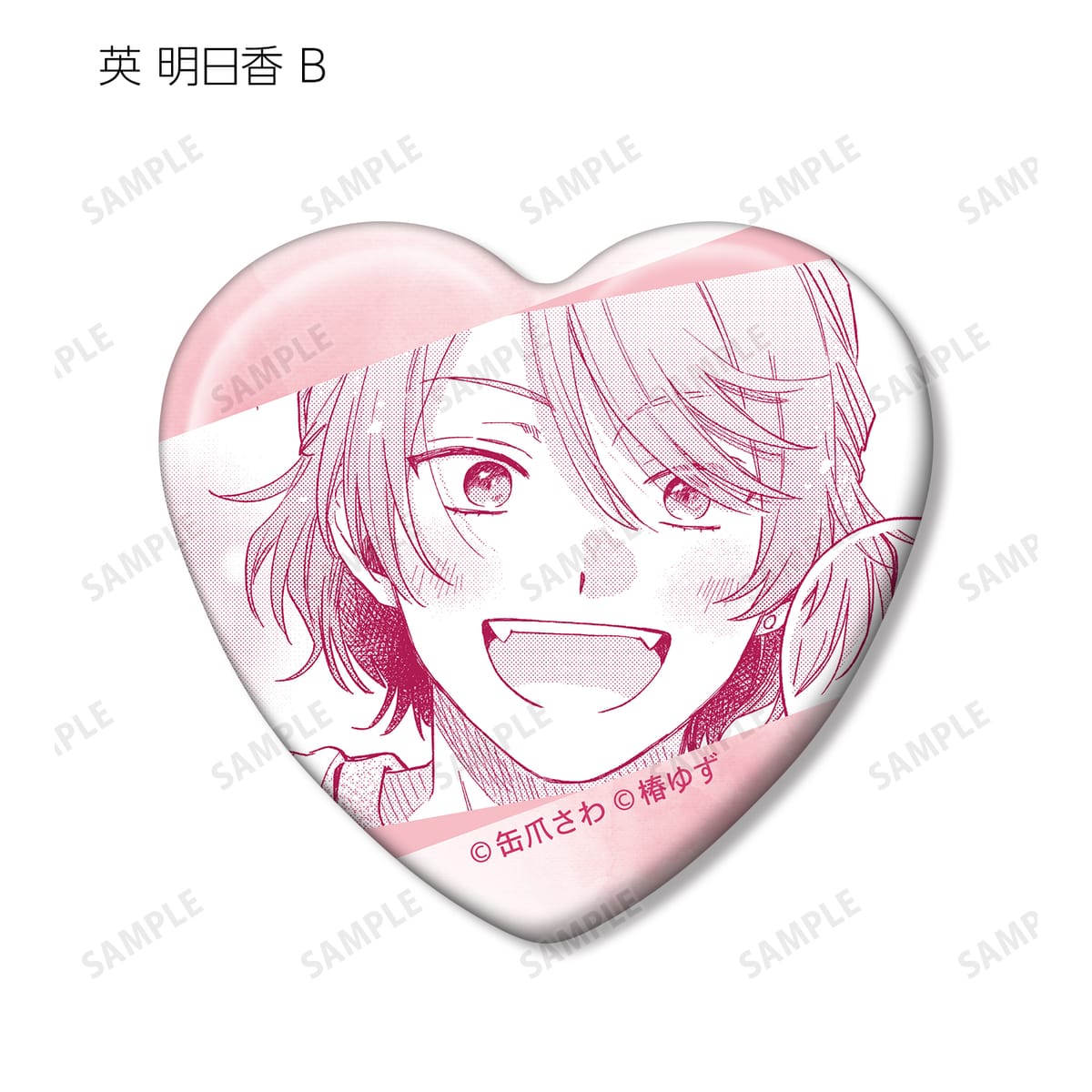 湊 晃、香月 慎太郎、英 明日香、佐久間 柊のカラーイラスト、原作コマをハート型の缶バッジに仕上げました。