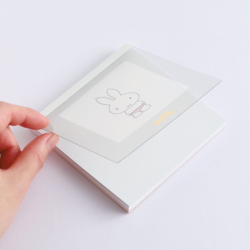 優しいカラーで生活に寄り添ってくれるメモパッドです。表紙はクリアタイプの硬質塩ビに絵柄をプリントしてあり、ロゴ部分は金箔押しが施されています。中面の絵柄は4種類です