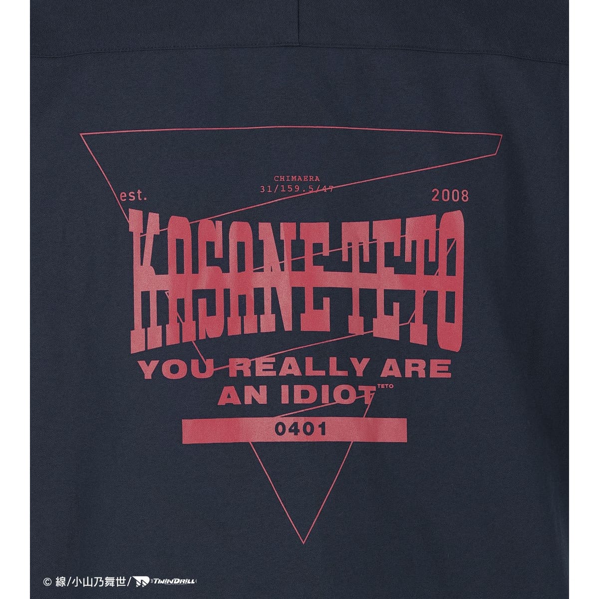 胸元には重音テトの顔のワッペン刺繍、背面にはプロフィールや決め台詞「君はじつに馬鹿だな」を英字グラフィックでクールに配置。