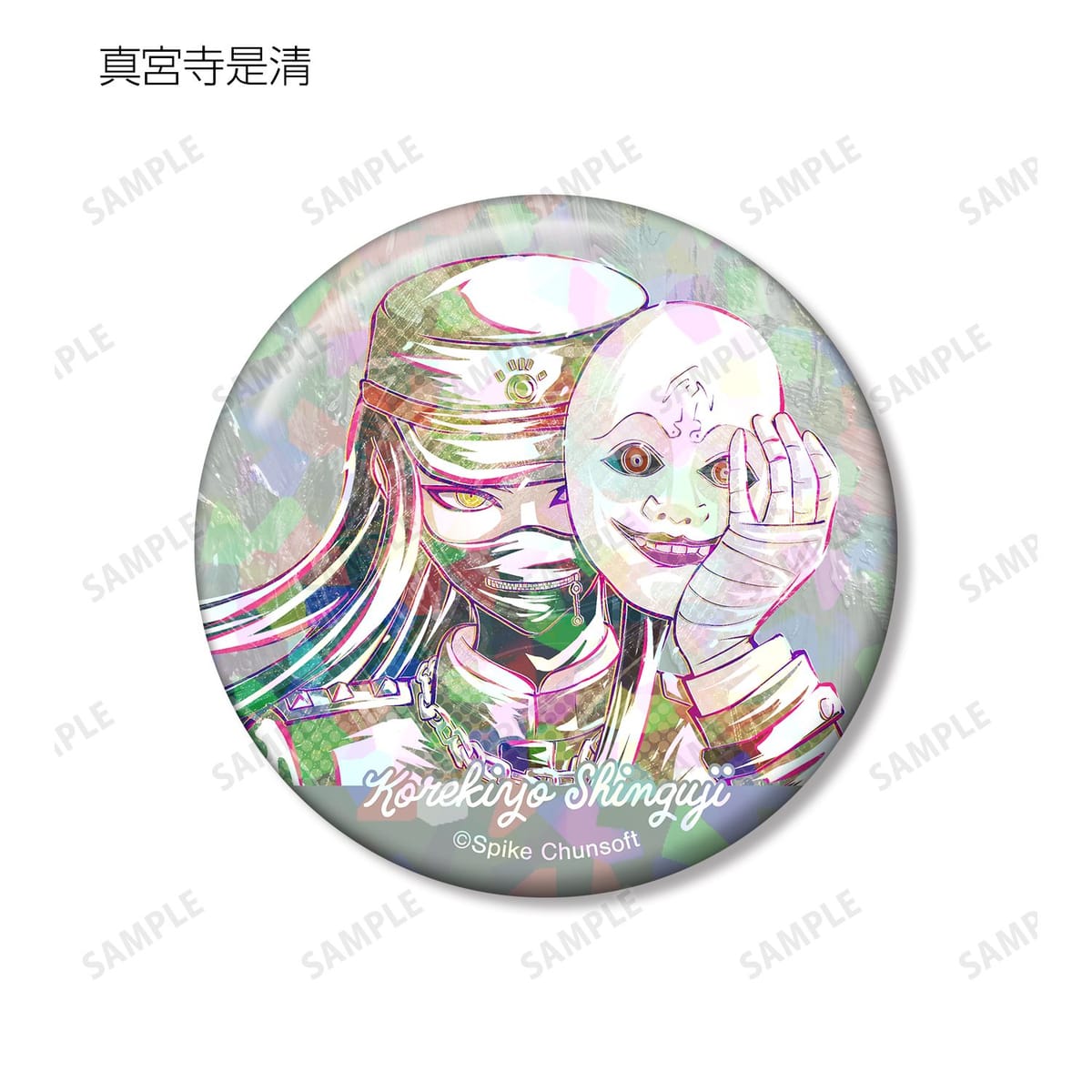 赤松楓、キーボ、最原終一、真宮寺是清、春川魔姫、星竜馬、夢野秘密子、夜長アンジーのイラストを新たなタッチで魅力的に表現し、ホログラム加工を施した缶バッジに仕上げました。