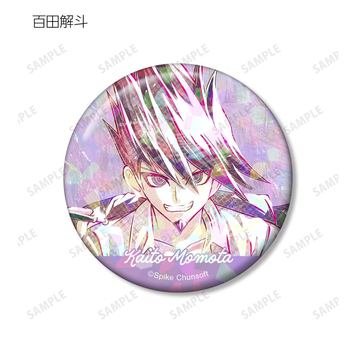 天海蘭太郎、入間美兎、王馬小吉、獄原ゴン太、白銀つむぎ、茶柱転子、東条斬美、百田解斗のイラストを新たなタッチで魅力的に表現し、ホログラム加工を施した缶バッジに仕上げました。