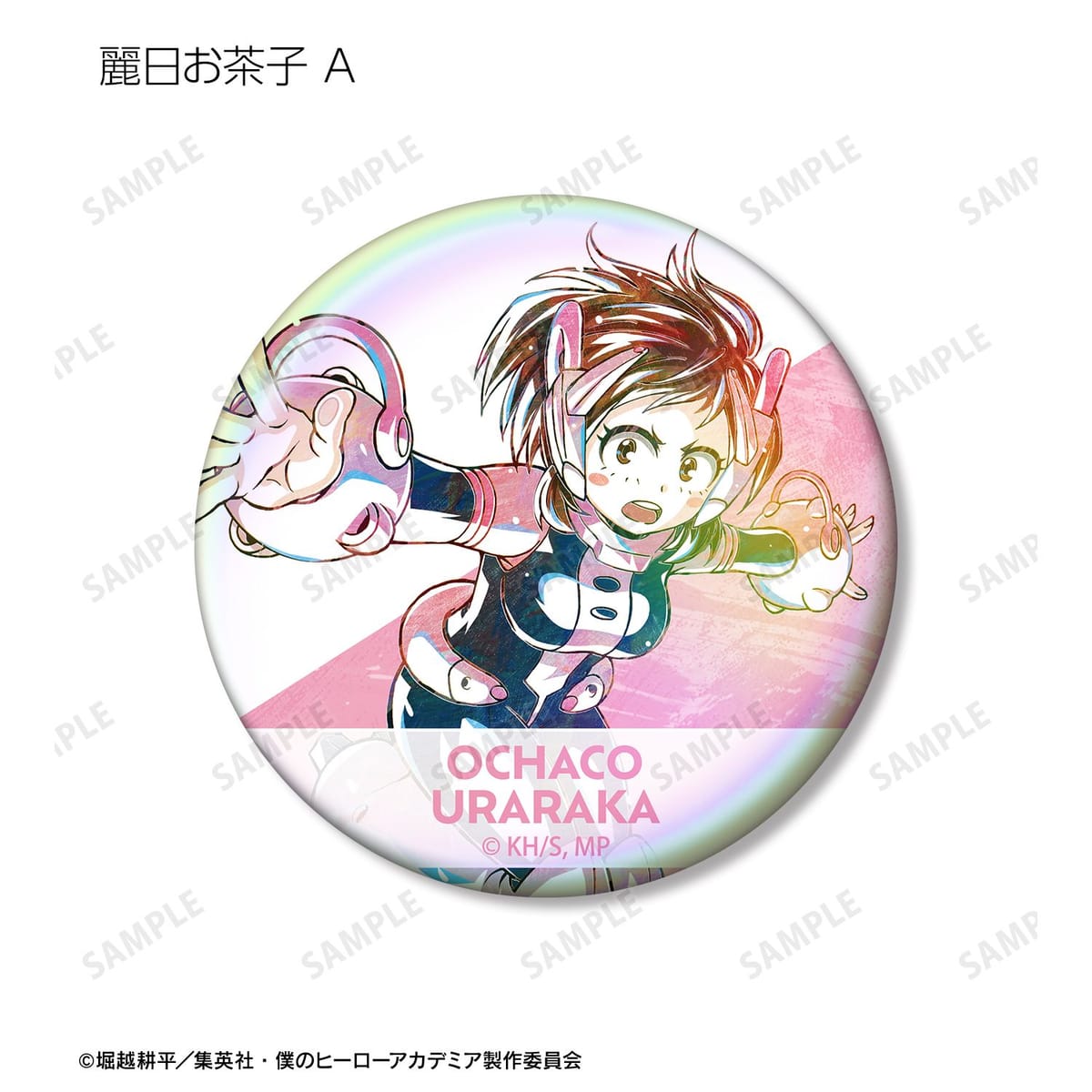 麗日お茶子、切島鋭児郎、小森希乃子、ミッドナイト、ホークス、ミルコ、トガヒミコ、オーバーホール、外典のビジュアルを新たなタッチで魅力的に表現し、オーロラ加工を施した缶バッジに仕上げました。