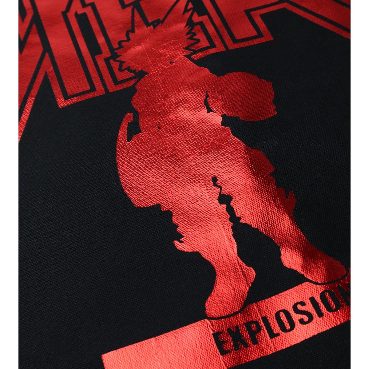 爆豪勝己のシルエット、個性名などを使用したデザインに、赤色の箔プリントを施しました。