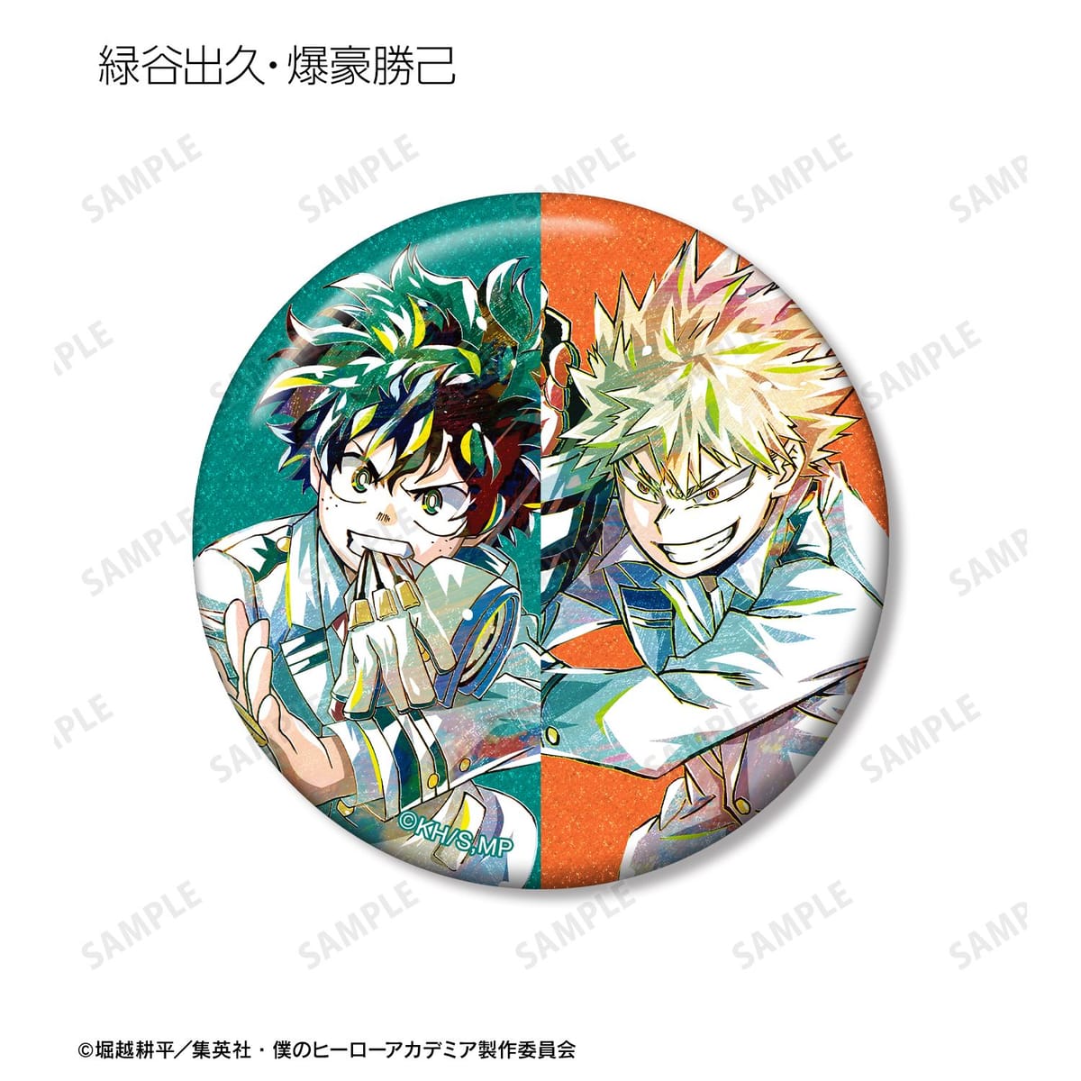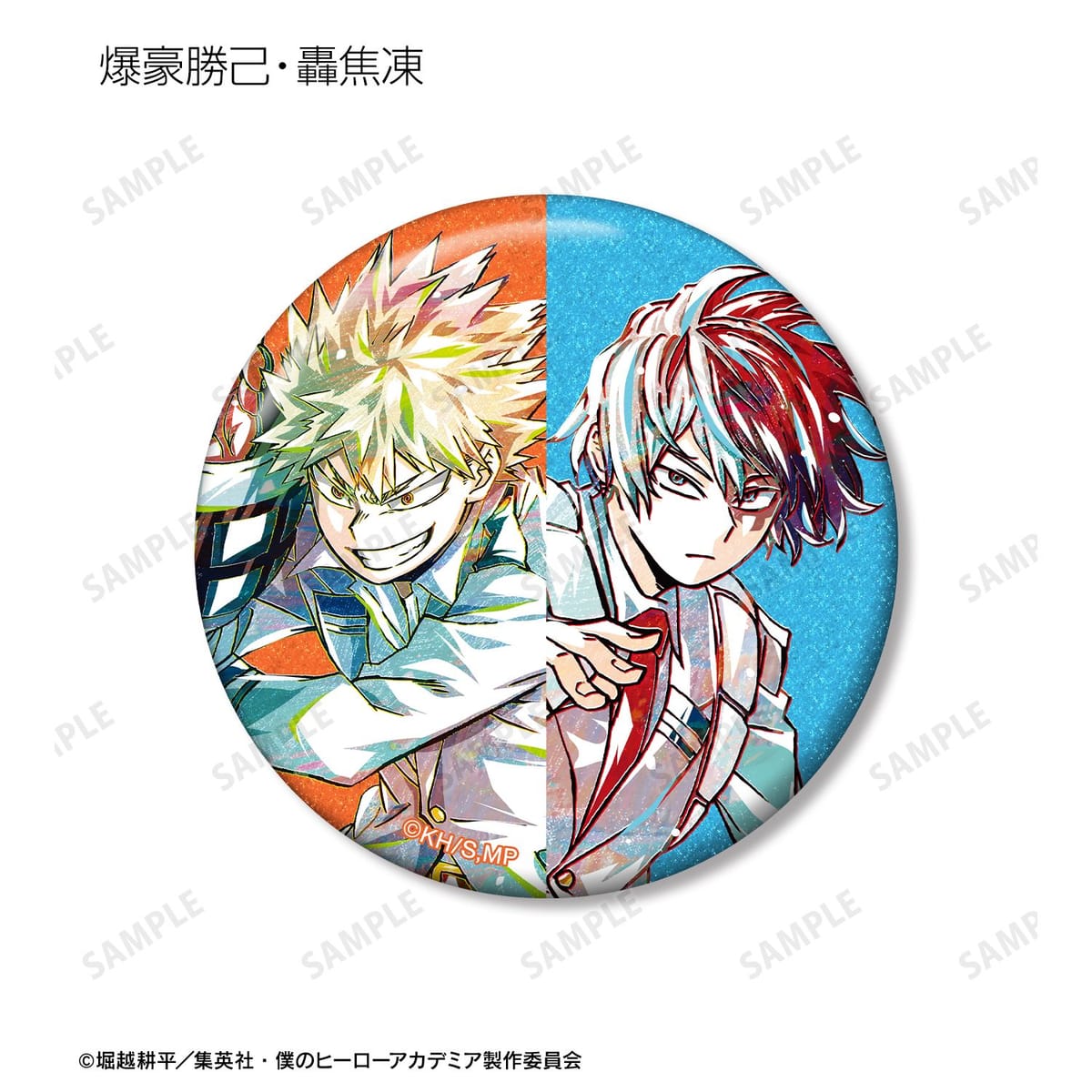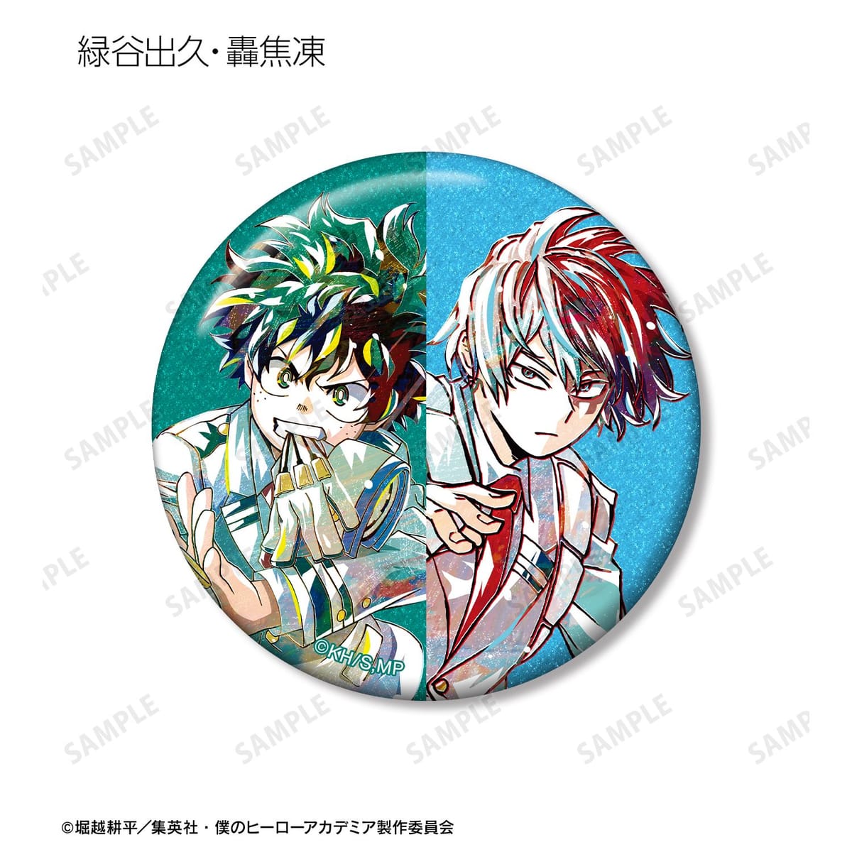 緑谷出久、爆豪勝己、轟焦凍のビジュアルを新たなタッチで魅力的に表現し、グリッター加工を施した缶バッジに仕上げました。