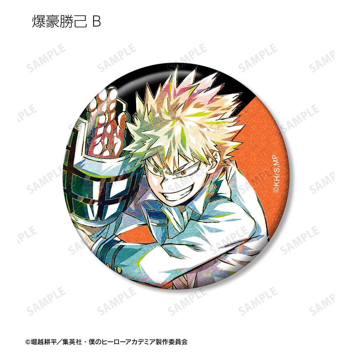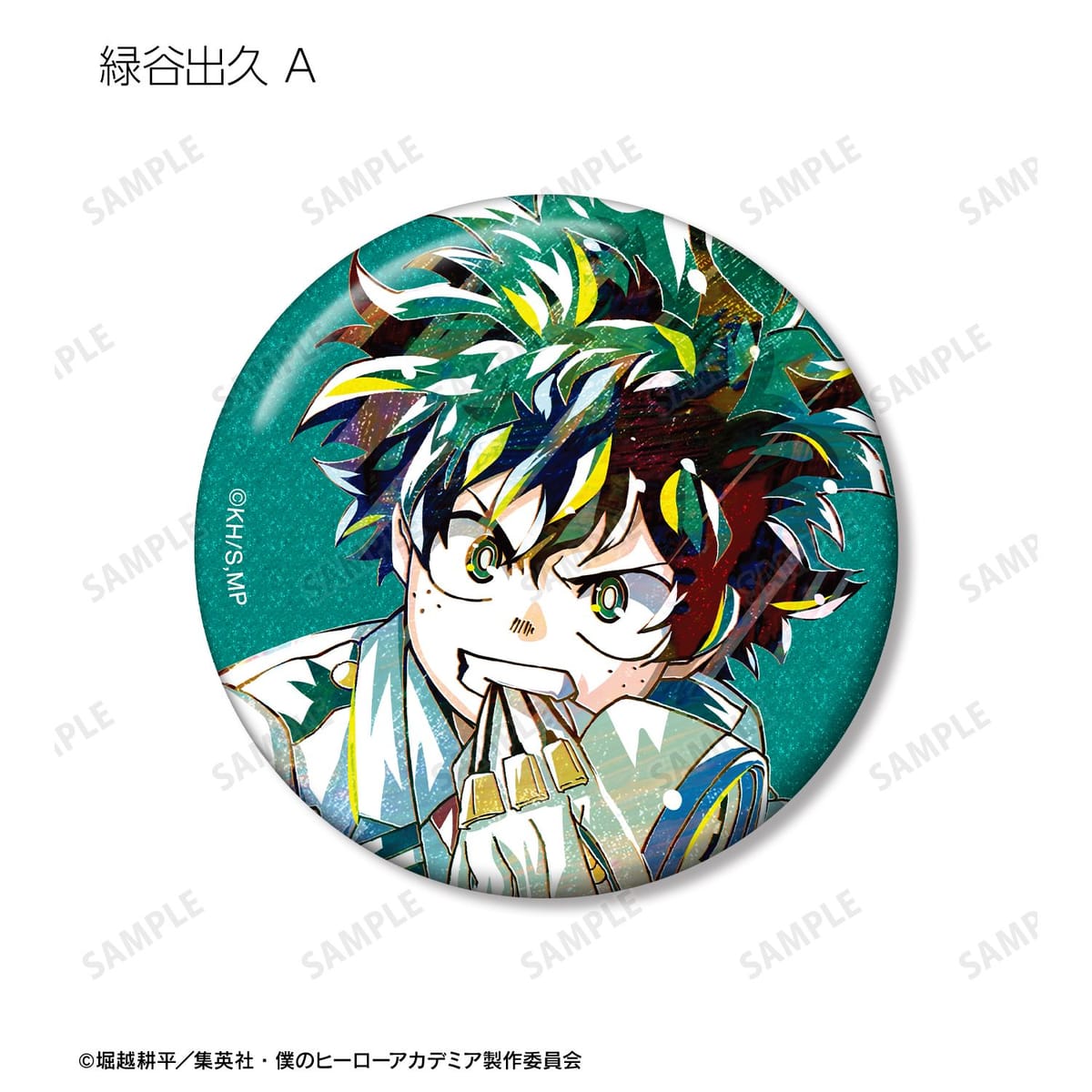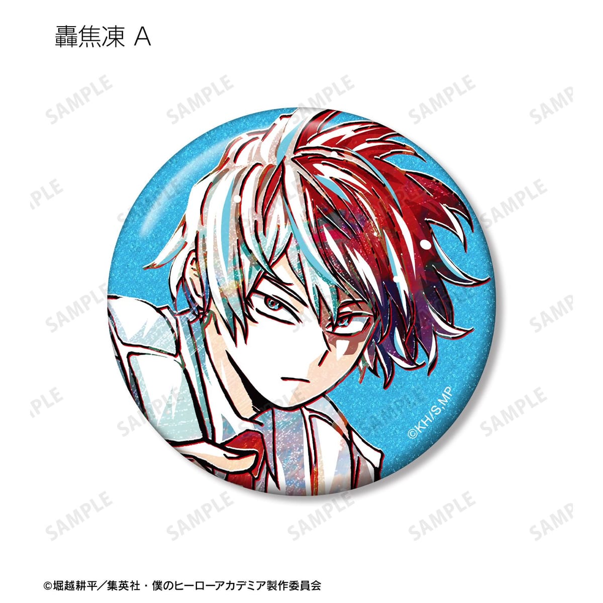 緑谷出久、爆豪勝己、轟焦凍のビジュアルを新たなタッチで魅力的に表現し、グリッター加工を施した缶バッジに仕上げました。