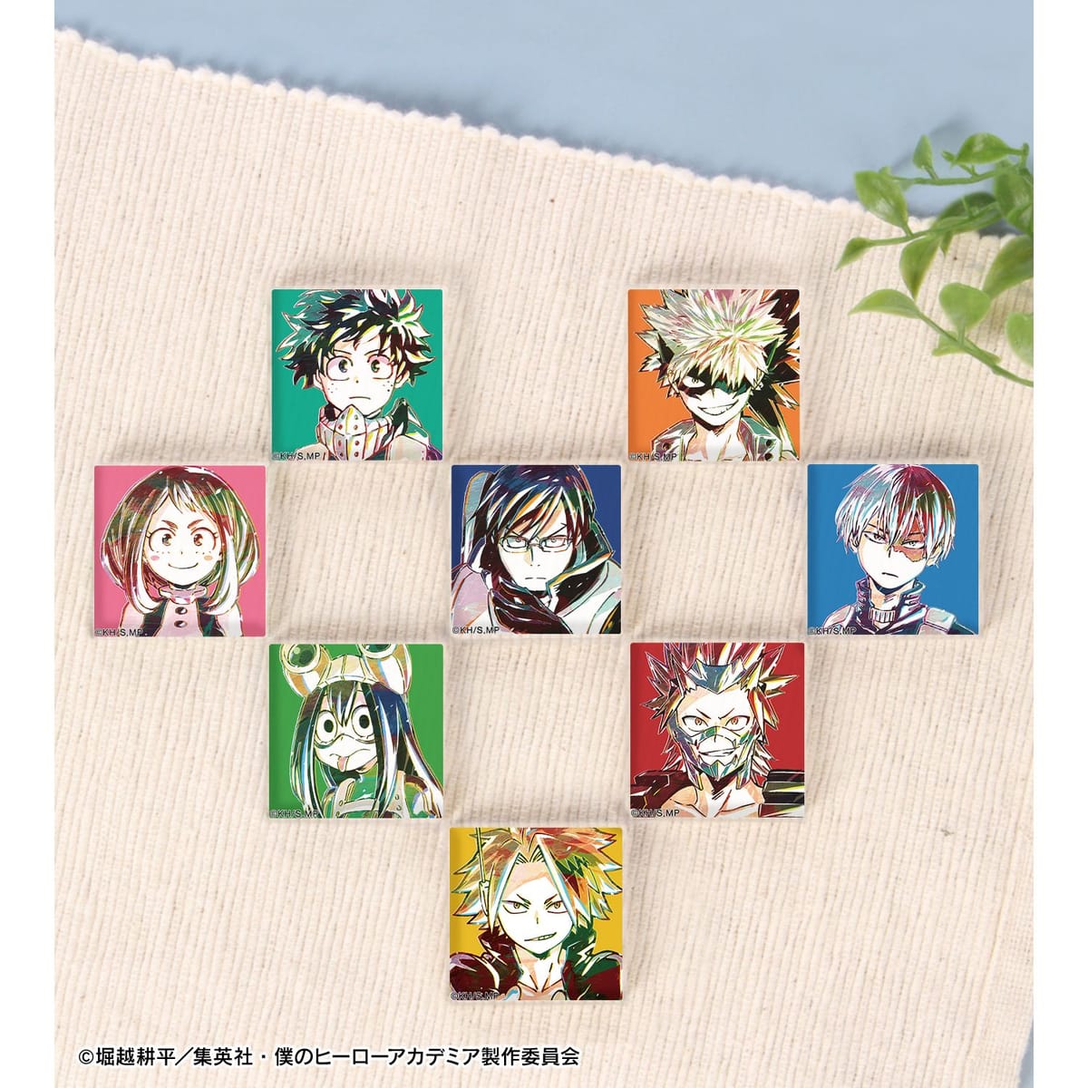 緑谷出久、爆豪勝己、麗日お茶子、飯田天哉、轟焦凍、蛙吹梅雨、切島鋭児郎、上鳴電気のビジュアルを新たなタッチで魅力的に表現し、アクリルタイルに仕上げました。
