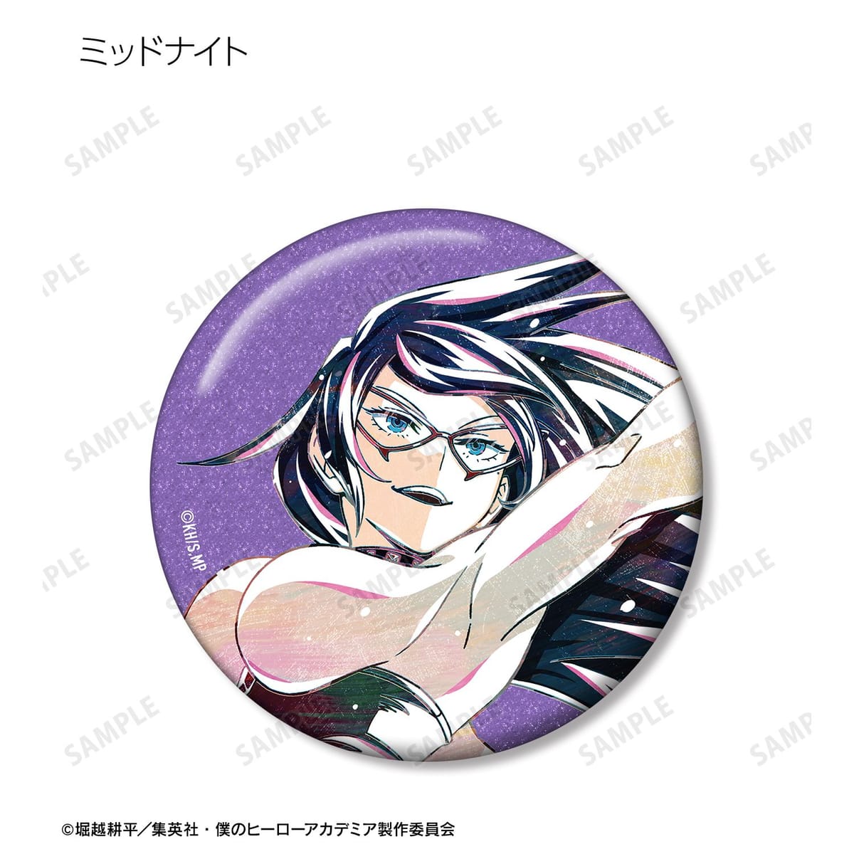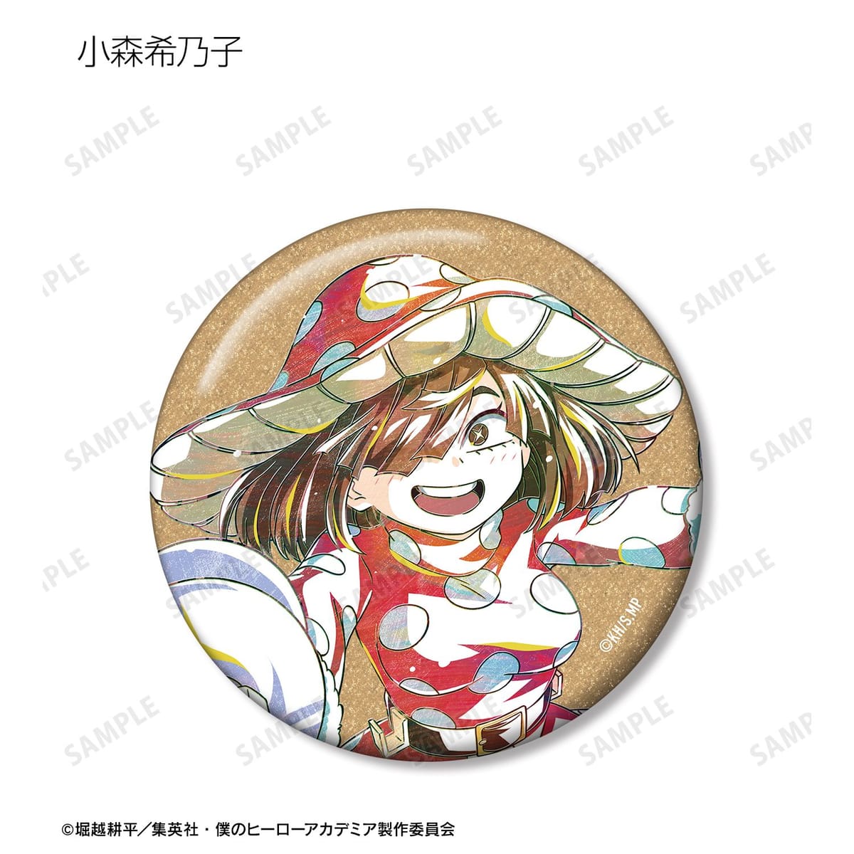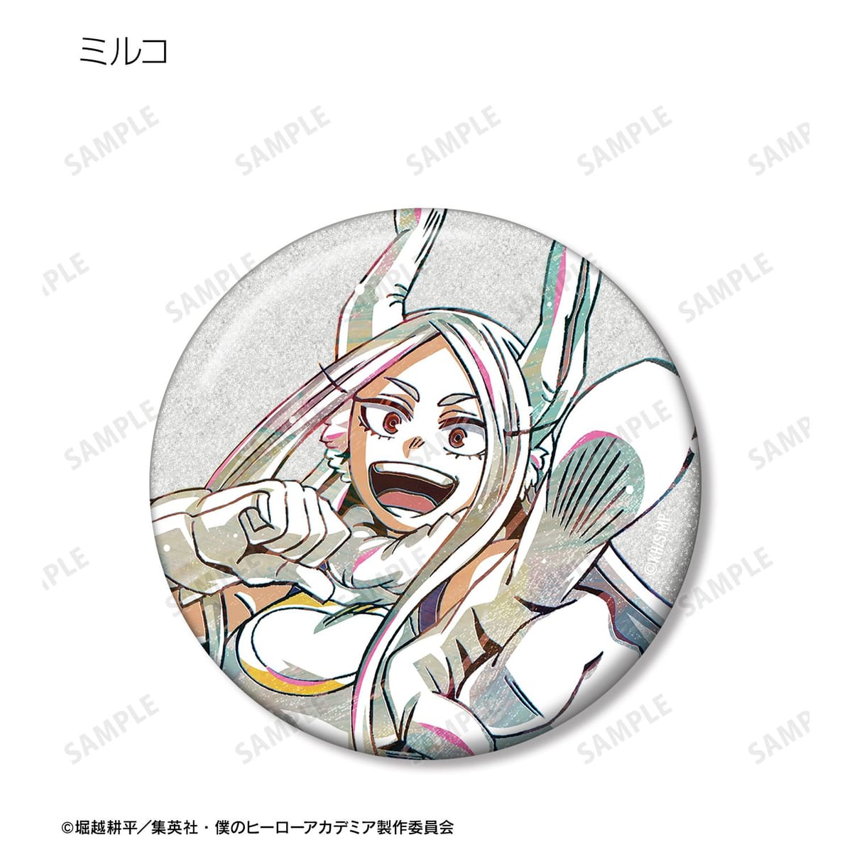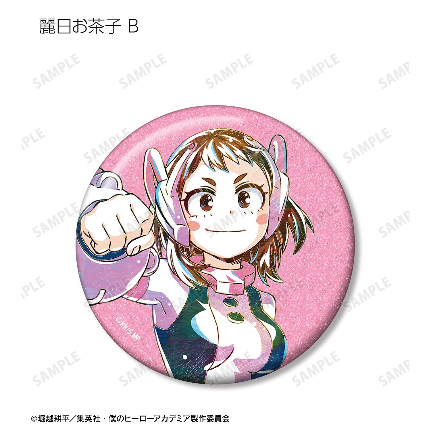 麗日お茶子、切島鋭児郎、小森希乃子、ミッドナイト、ホークス、ミルコ、トガヒミコ、オーバーホール、外典のビジュアルを新たなタッチで魅力的に表現し、グリッター加工を施した缶バッジに仕上げました。
