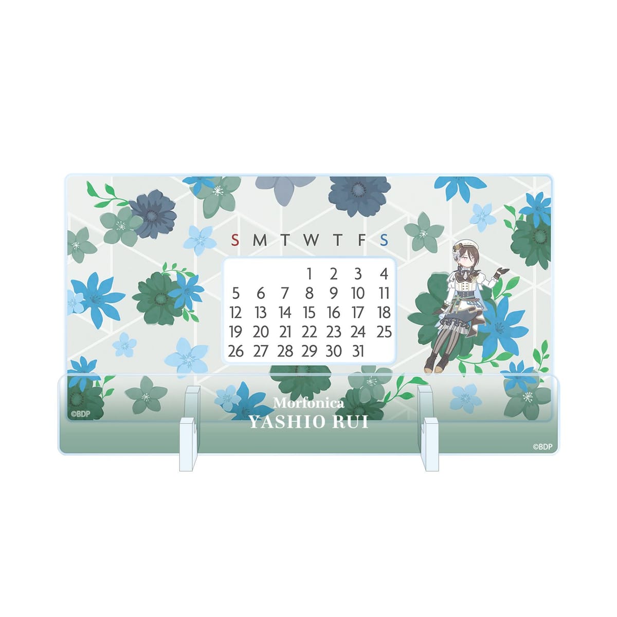 八潮 瑠唯のイラストをボタニカルデザインに落とし込んで繊細なタッチで新たに描き起こし、卓上アクリル万年カレンダーに仕上げました。