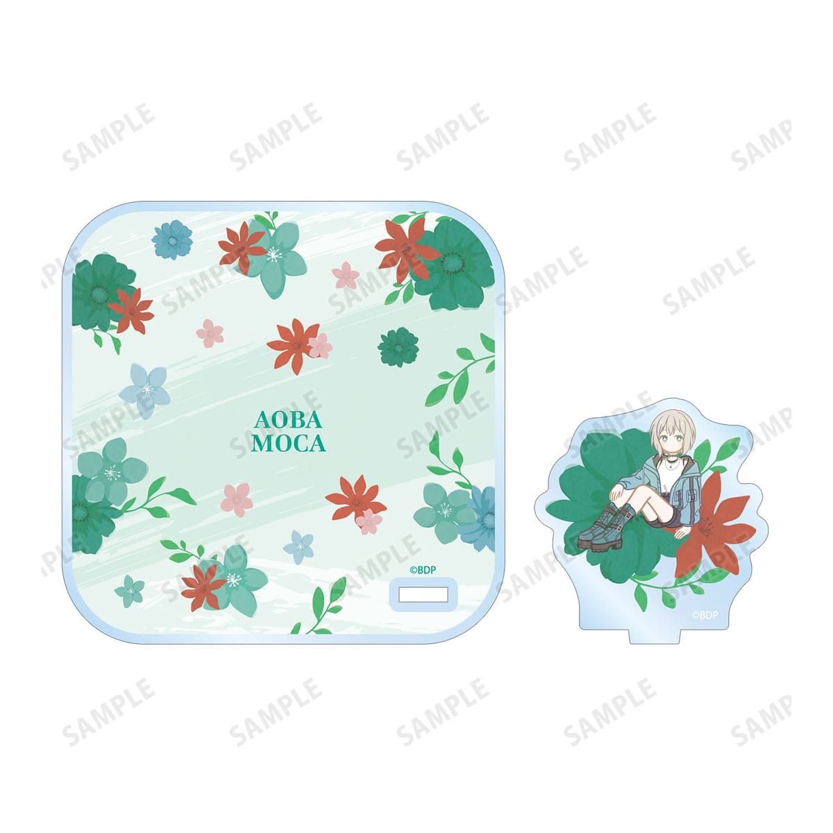 青葉 モカのイラストをボタニカルデザインに落とし込んで繊細なタッチで新たに描き起こし、アクリルスタンド付きコースターに仕上げました。