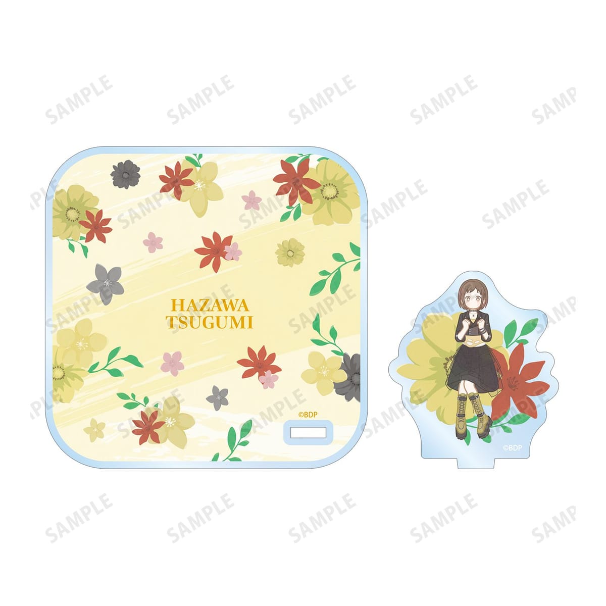 羽沢 つぐみのイラストをボタニカルデザインに落とし込んで繊細なタッチで新たに描き起こし、アクリルスタンド付きコースターに仕上げました。