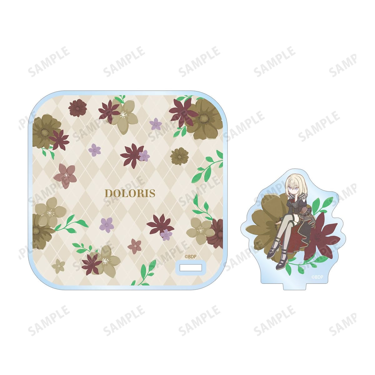 ドロリスのイラストをボタニカルデザインに落とし込んで繊細なタッチで新たに描き起こし、アクリルスタンド付きコースターに仕上げました。