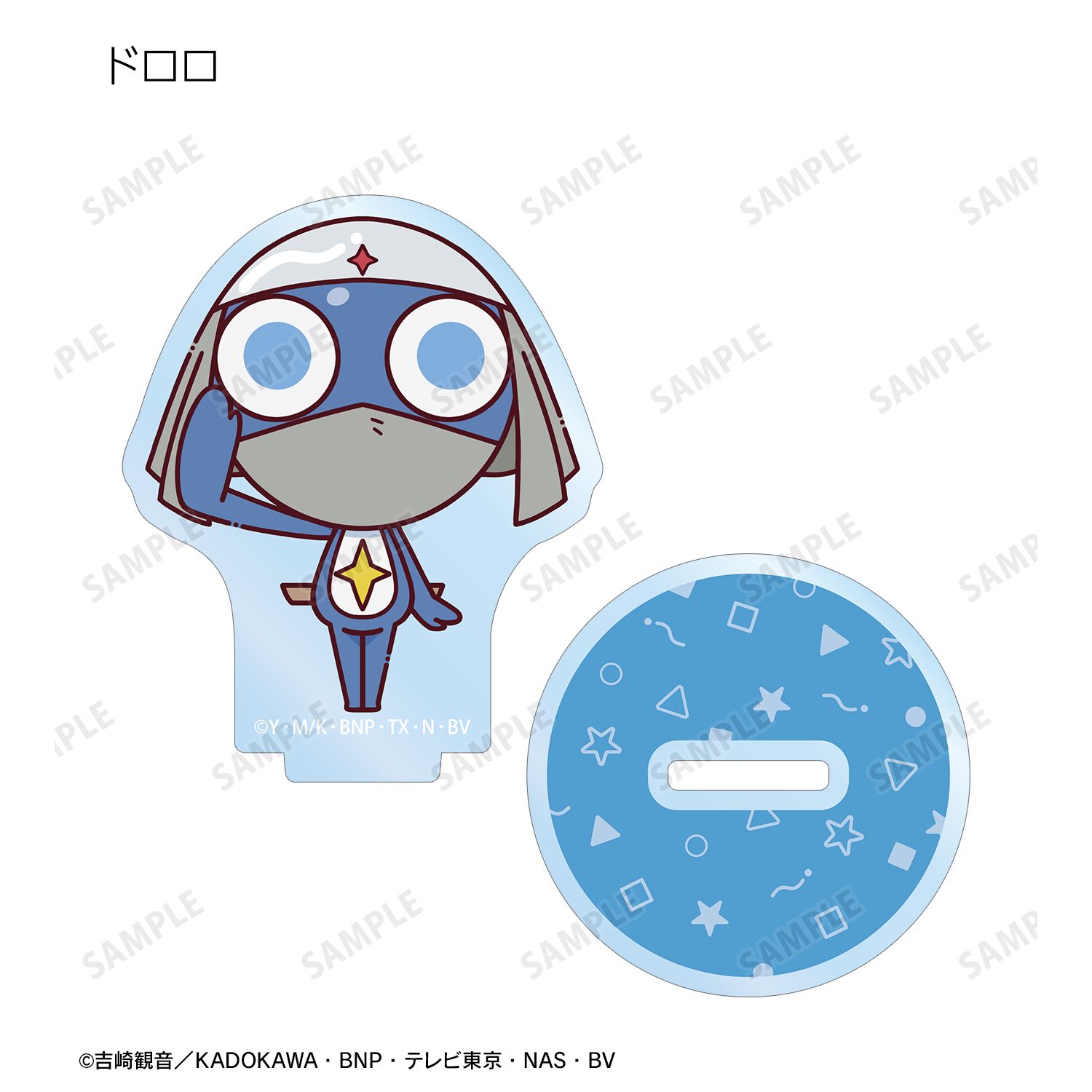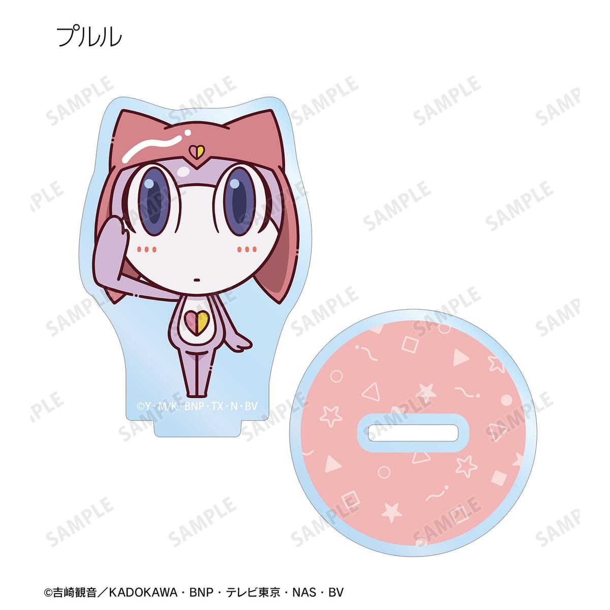 ケロロ、タママ、ギロロ、クルル、ドロロ、ガルル、タルル、トロロ、ゾルル、プルル、冬樹、夏美、桃華、サブロー、小雪がちょこんと立っているちびキャラを新たに描き起こし、アクリルスタンドに仕上げました。