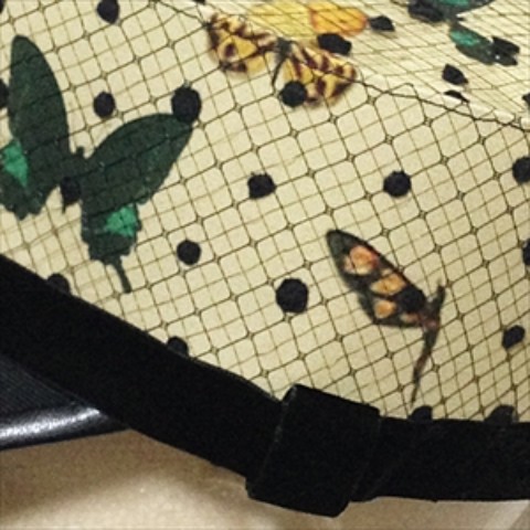 ”カラフルな蝶ーが並ぶ布地に黒のチュールをかぶせて、