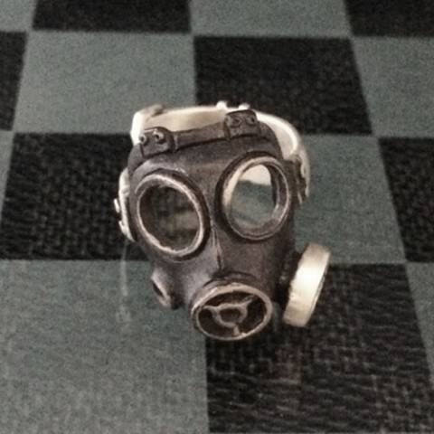 ガスマスクリングのフルフェイスタイプ少し小ぶりな作りのためハードなデザインの割に着けやすく仕上がっている